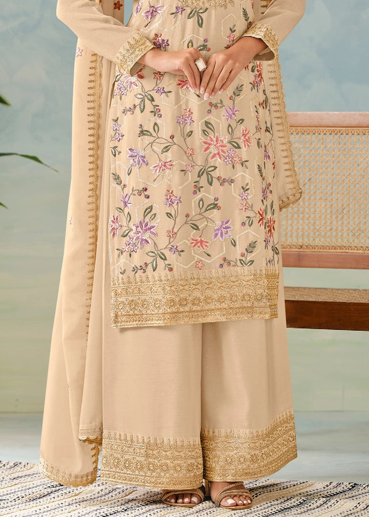 Beige Brown Palazzo Suit in Chinon Silk with Intricate Embroidery