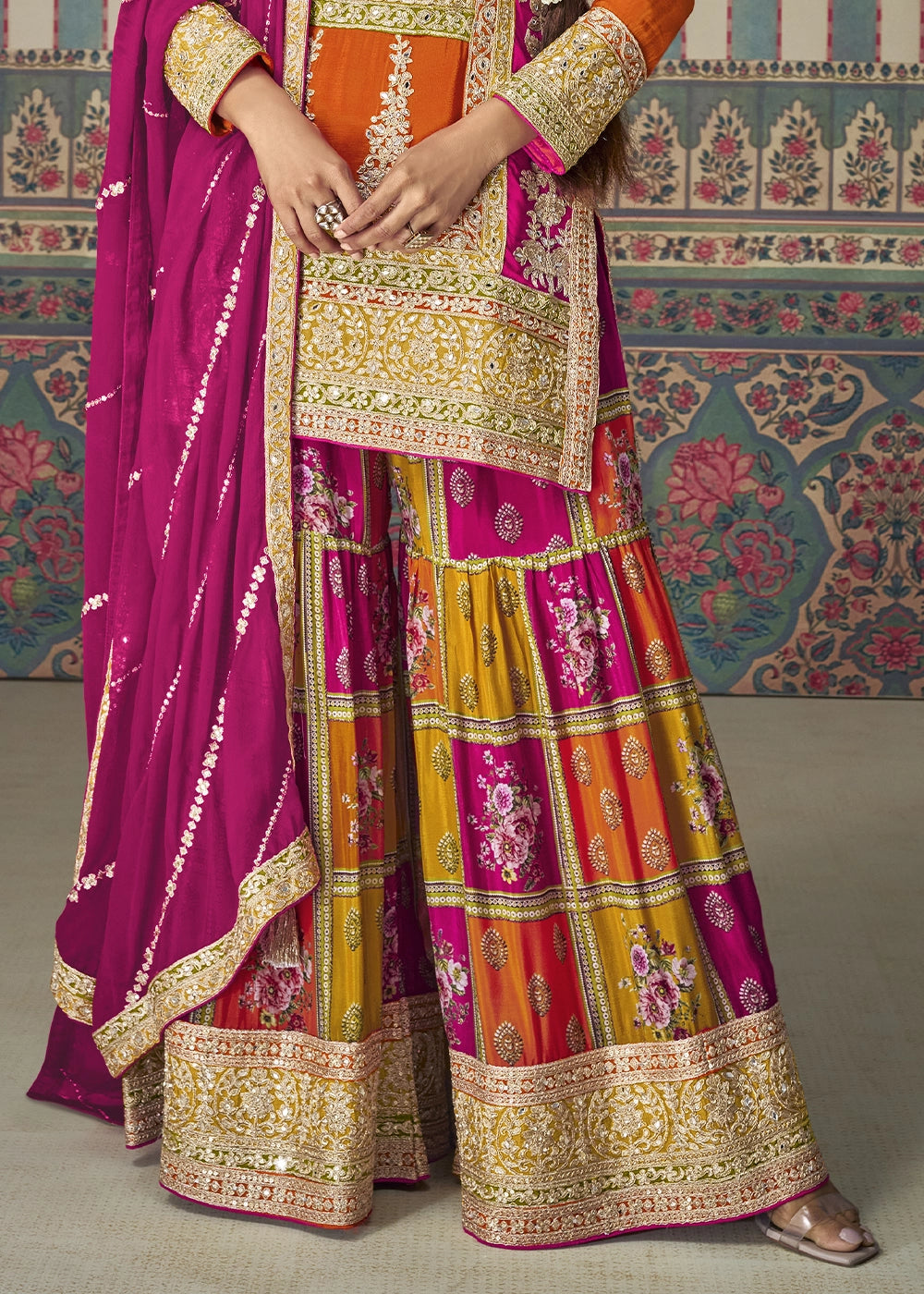 Fire Orange Chinon Silk Palazzo Suit with Allover Embroidery & Magenta Dupatta