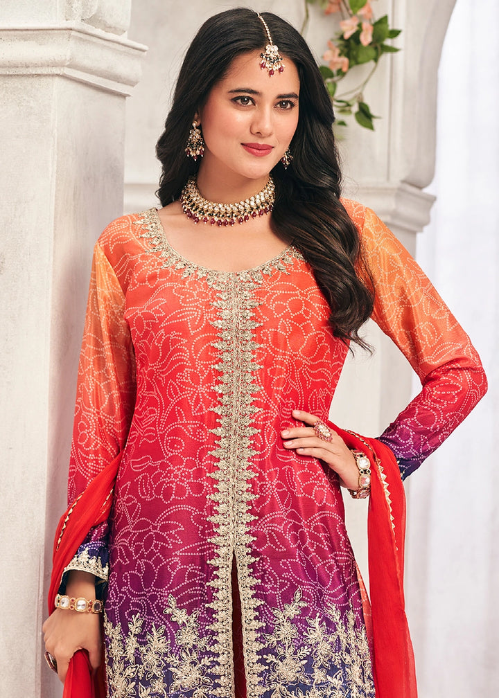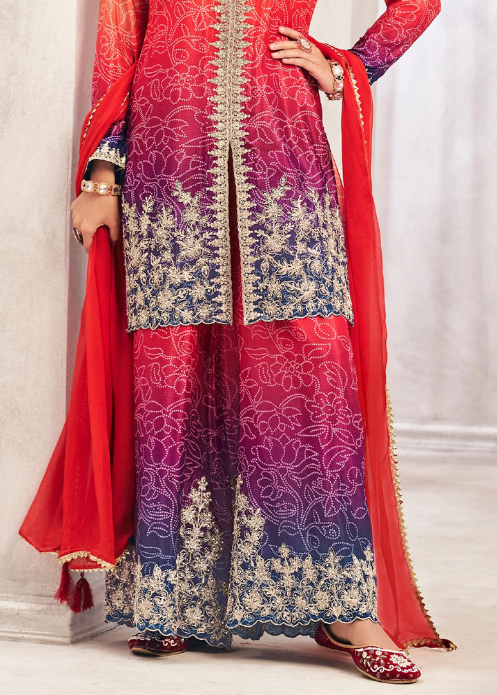 Graceful Orange Pink Embroidered Palazzo Suit in Flowing Chinon Silk