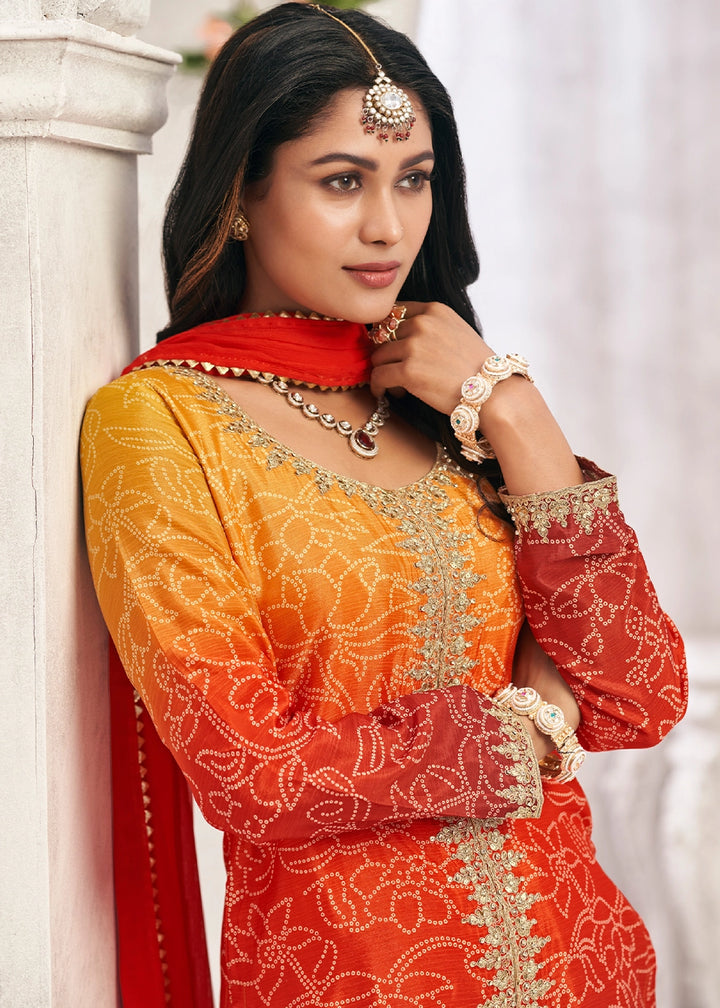 Graceful Orange Yellow Embroidered Palazzo Suit in Flowing Chinon Silk