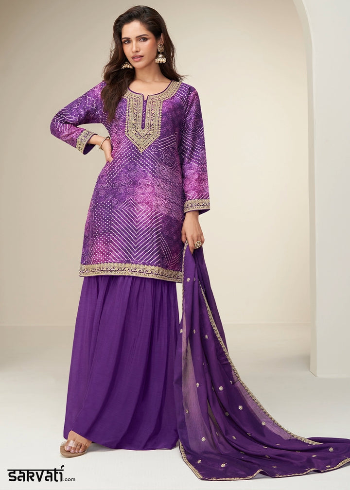 Grape Purple Printed Chinon Silk Palazzo Set with Embroidered Kurta