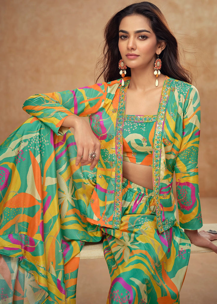 Green Multi-Toned Chinon Silk Palazzo Set with Digital Print & Jacket