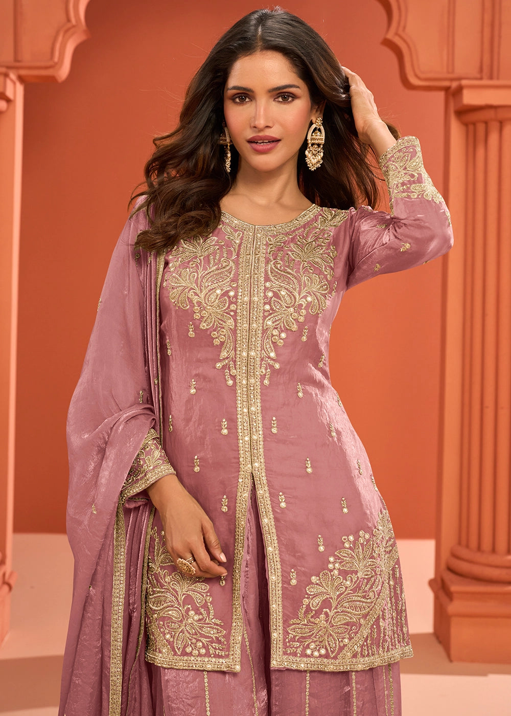 Lilac Purple Premium Silk Palazzo Suit with Embroidered Detailing
