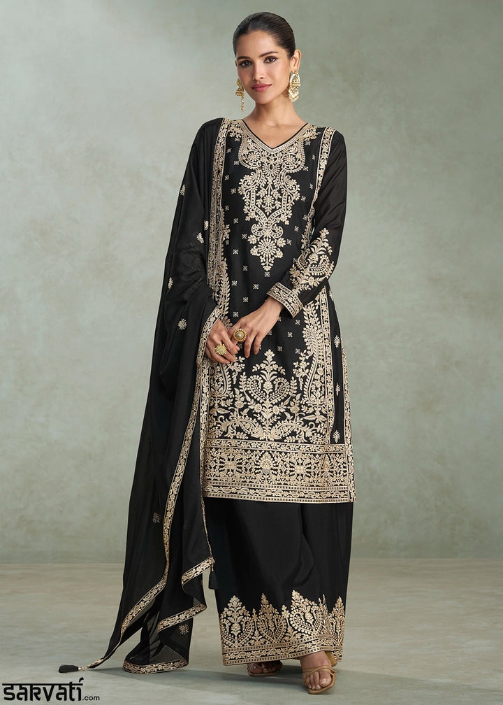 Pebble Black Embroidered Chinon Silk Palazzo Suit for Festive Wear