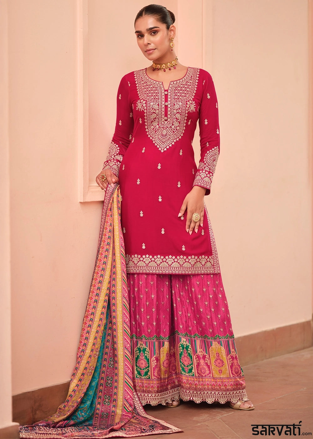 Ruby Pink Embroidered Chinon Silk Kurta with Designer Palazzo and Dupatta