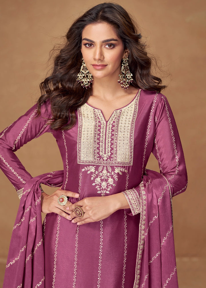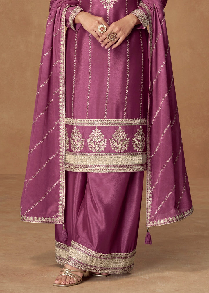 Wildberry Purple Palazzo Suit Set in Chinon Silk with Intricate Embroidery