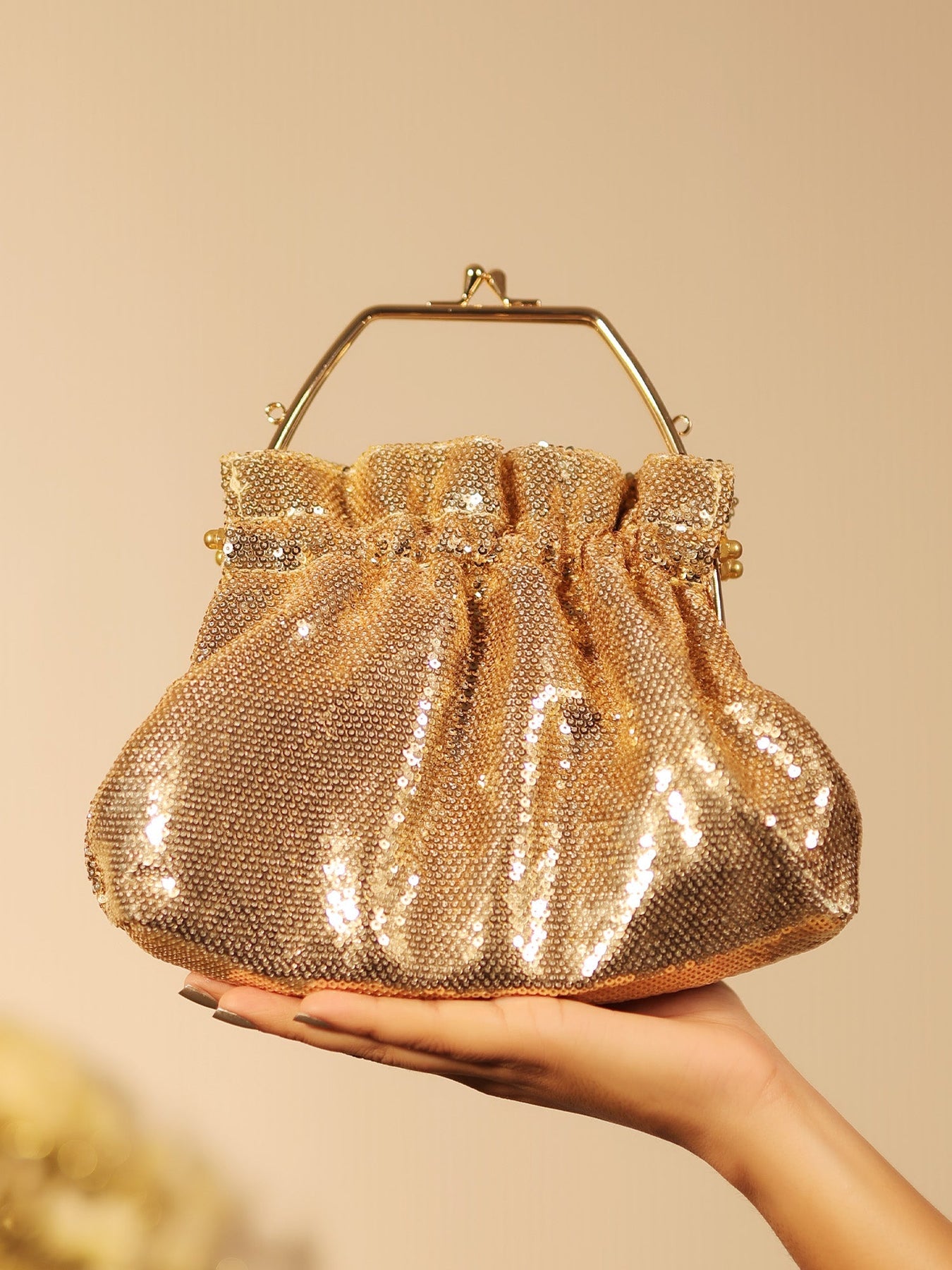 This Elegant Golden Evening Clutch Combines A Luxurious Fabric Exterior With A Sturdy Metal Handle, Offering Both Style And Durability. Its Compact Design Is Perfect For Carrying Essentials During Formal Events, While The Metal Handle Adds A Sophisticated Touch And Ensures Comfortable Grip. Ideal For Complementing Evening Wear With A Refined Finish.