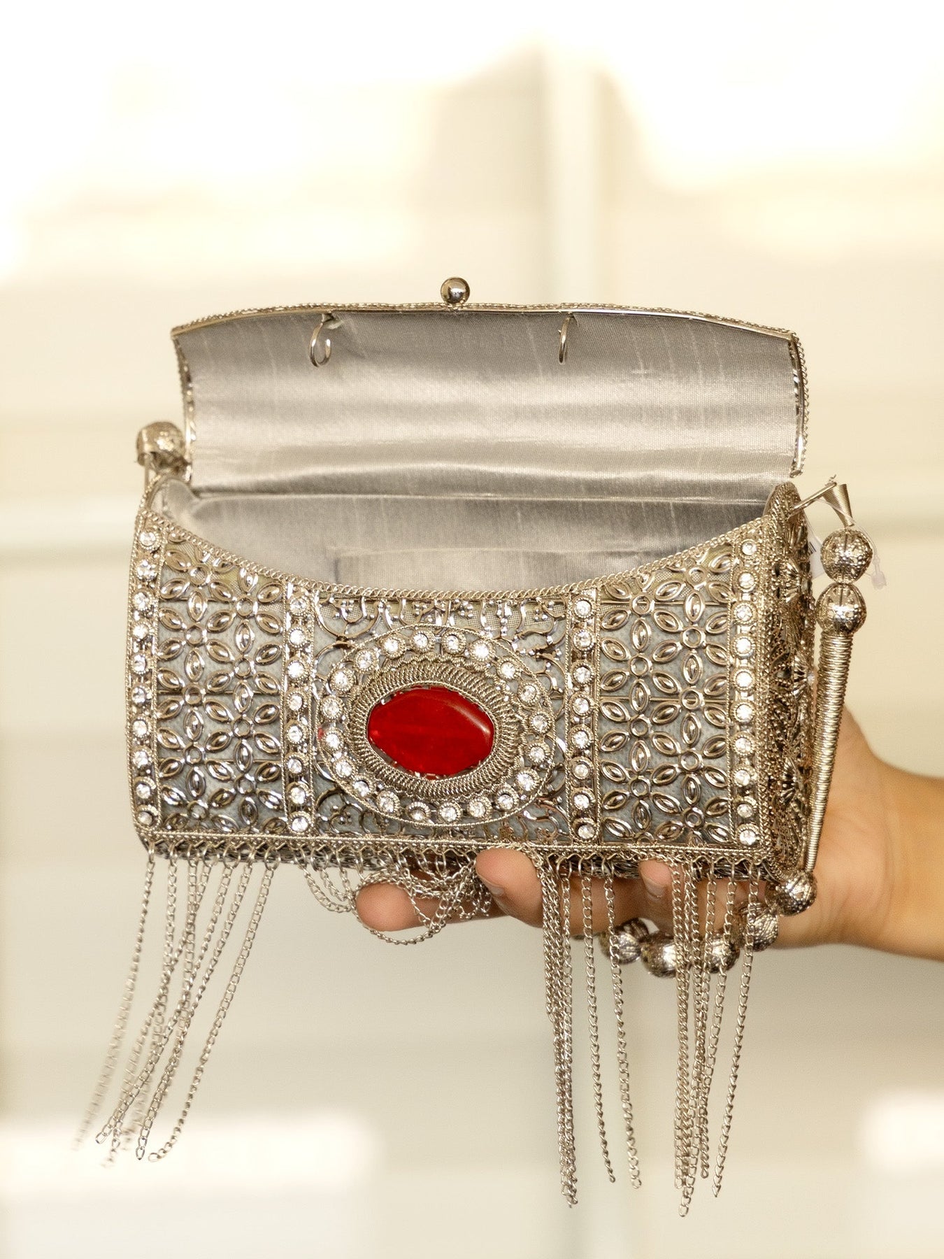 This Elegant Silver Evening Clutch Is The Perfect Accessory For Any Special Occasion. Crafted With Silver-plated Brass Metal And Adorned With High-quality Semi-precious Stones, It Exudes Luxury And Sophistication. Add A Touch Of Glamour To Your Outfit With This Stunning Evening Clutch.