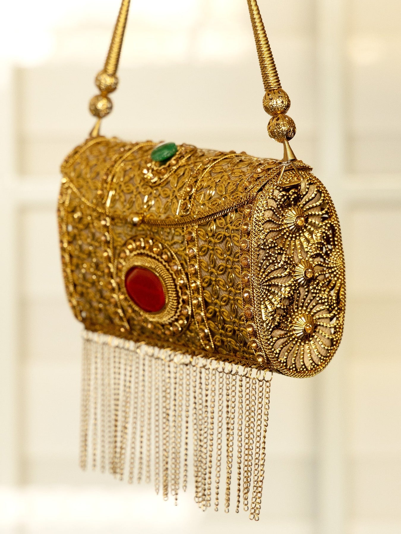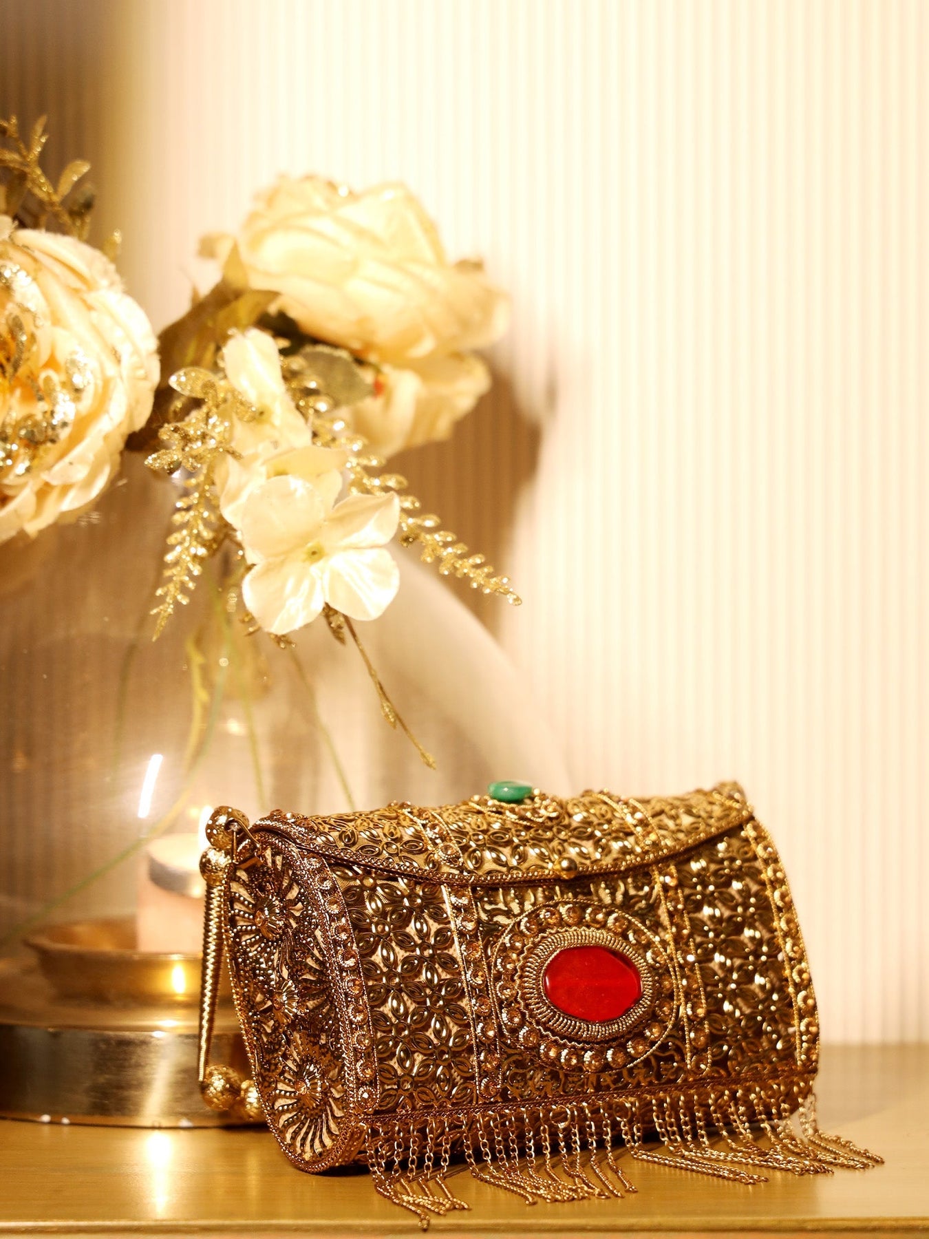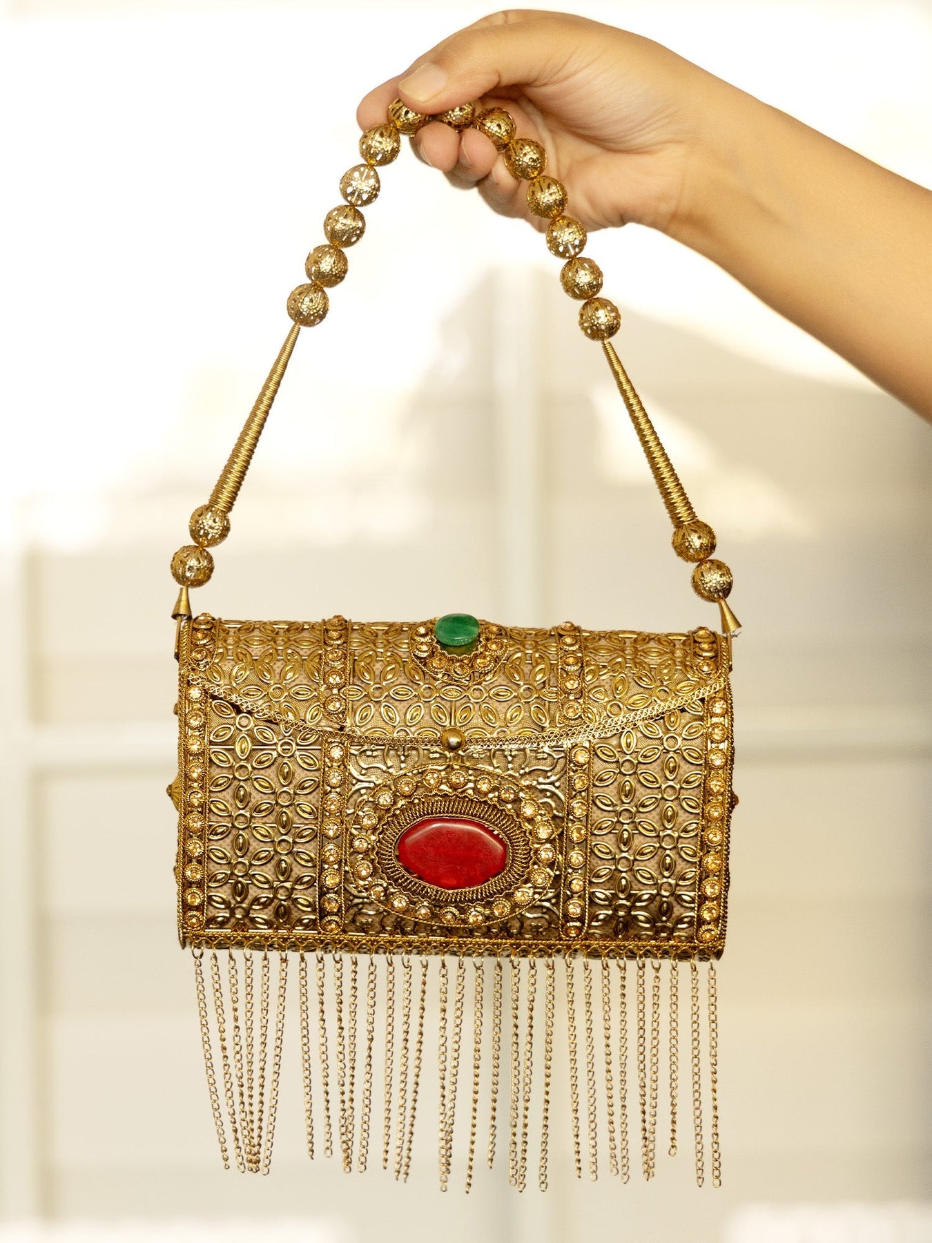 This Elegant Golden Evening Clutch Is The Perfect Accessory For Any Special Occasion. Crafted With Gold-plated Brass Metal And Adorned With High-quality Semi-precious Stones, It Exudes Luxury And Sophistication. Add A Touch Of Glamour To Your Outfit With This Stunning Evening Clutch.