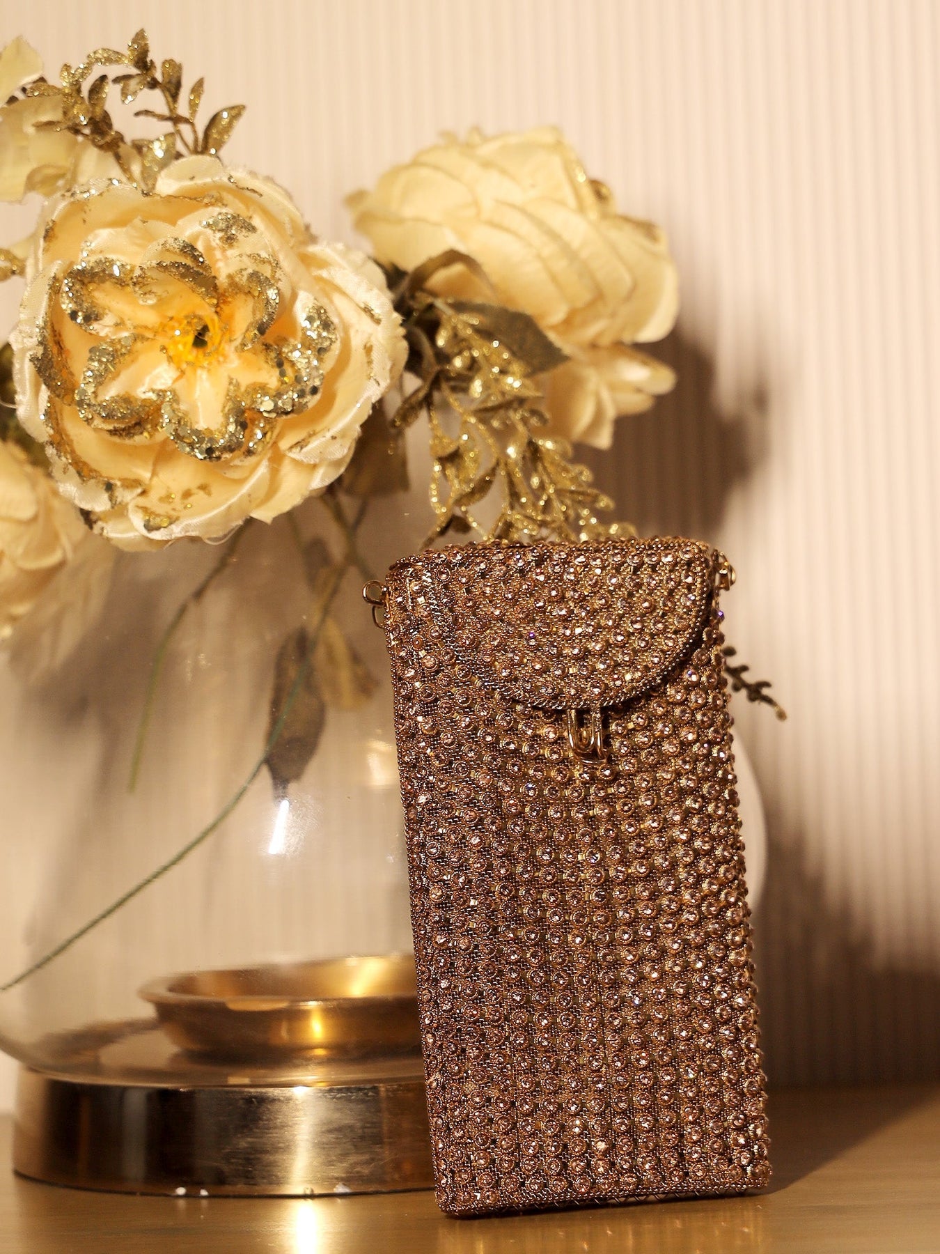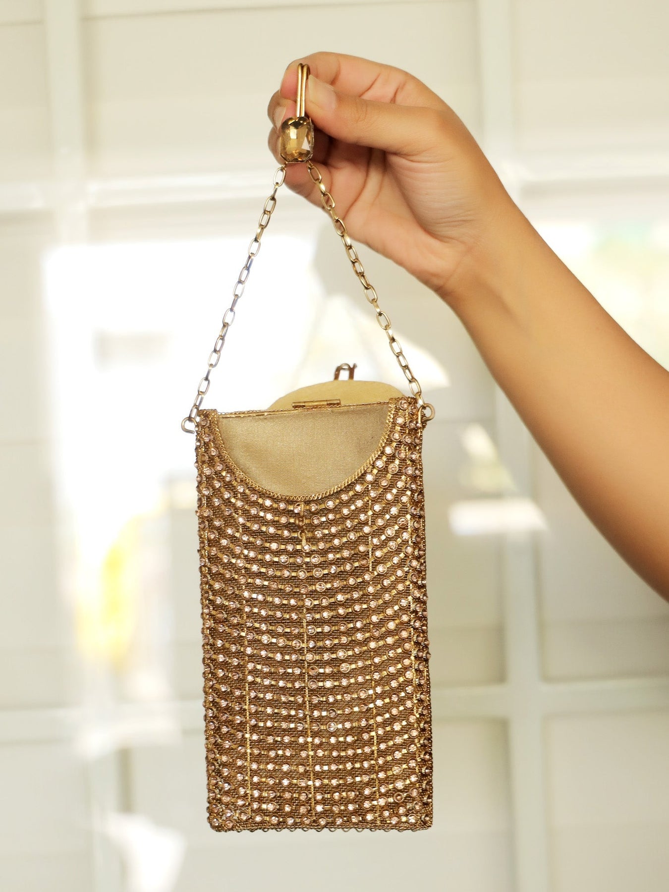 The Golden Mobile Pouch Is An Elegant And Convenient Storage Solution For Your Mobile Device. Crafted With Gold Plated Brass Metal And A Beautiful Pearl Hanging, This Pouch Is Lightweight And Easy To Carry, Providing Effortless Protection For Your Phone.