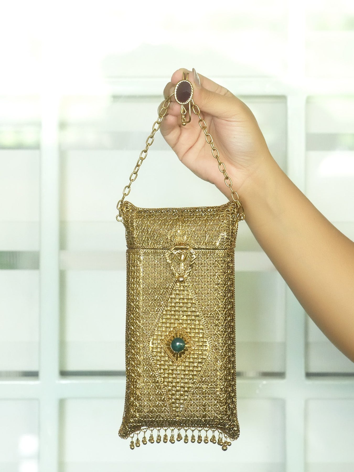 This Elegant Golden Mobile Pouch Combines Gold-plated Brass Metal With Decorative Beads And A Distinctive Metal Ball Hanging For A Refined Look. Designed For Both Style And Convenience, It Is Also Available With A Sling Chain For Easy Carrying. Perfect For Protecting Your Phone While Making A Sophisticated Statement.