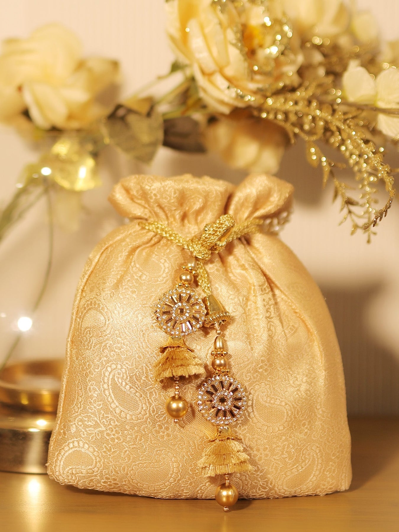 Elevate Your Style With Our Luxurious Golden Potli Bag. Crafted From High-quality Golden Fabric, This Elegant Bag Features Delicate Pearls Hanging For A Touch Of Sophistication. Perfect For Any Occasion, This Potli Bag Adds A Touch Of Glamour To Any Outfit.