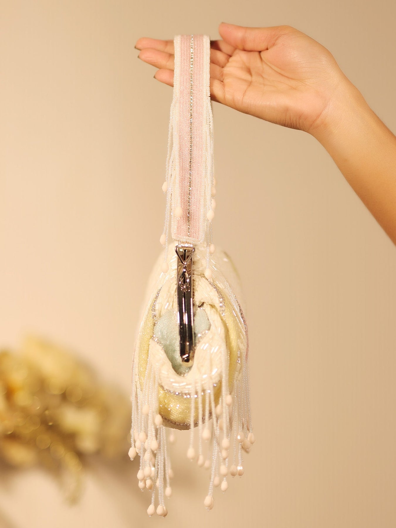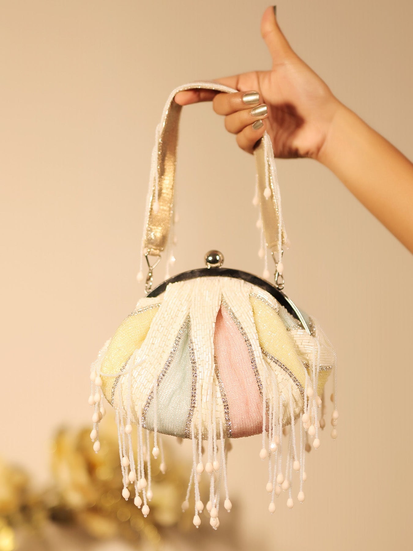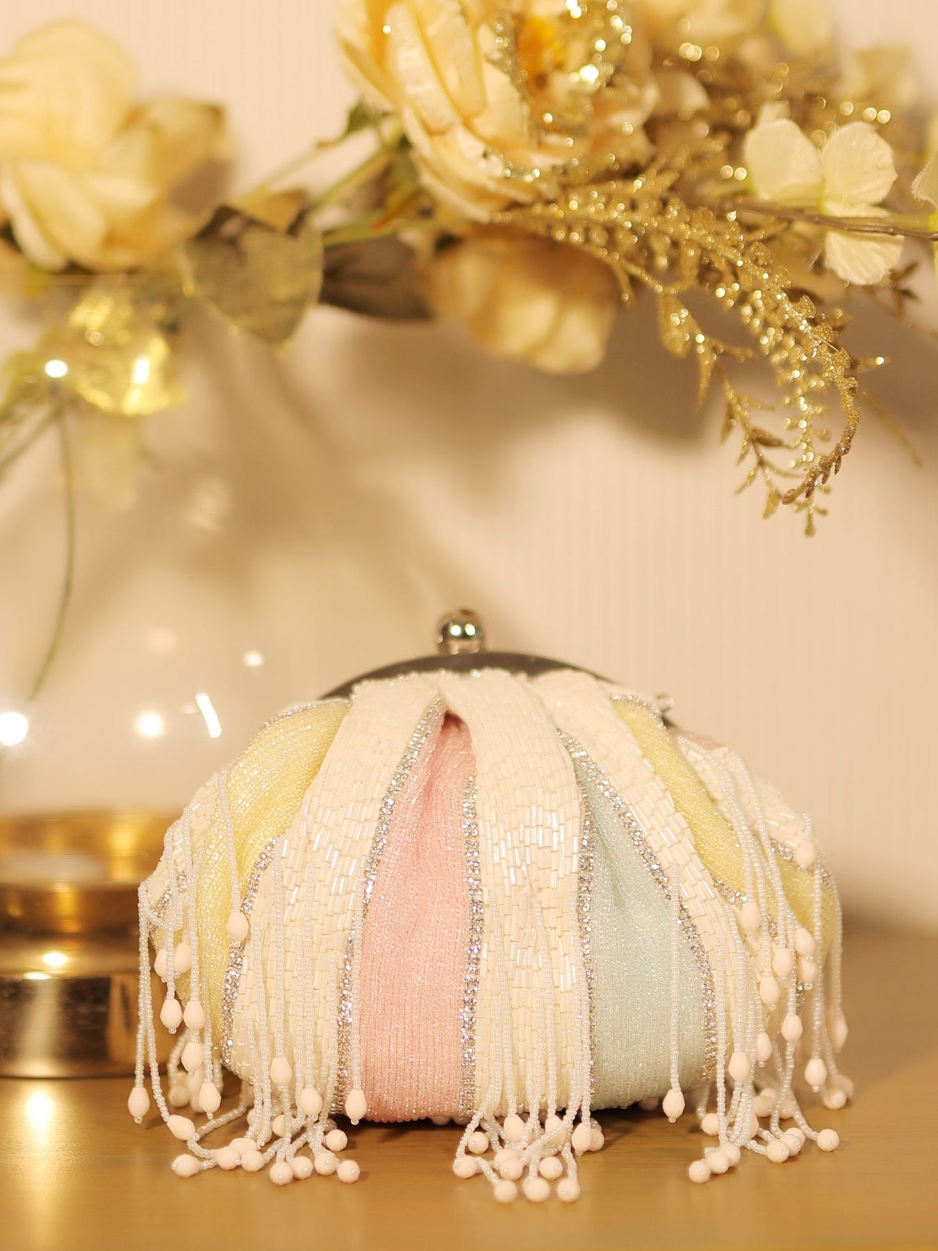 This Multi-colour Evening Clutch Features A Sturdy Metal Frame And Exquisite Handmade Cutdana Embroidery On Fabric, Combining Durability With Intricate Craftsmanship. Its Vibrant Design Makes It An Elegant Accessory For Formal Occasions, Offering Both Style And Functionality. Perfect For Carrying Essentials While Enhancing Your Evening Ensemble.