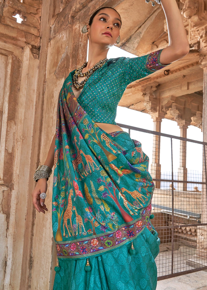 Cerulean Blue Printed Silk Saree with Floral & Jungle Motifs