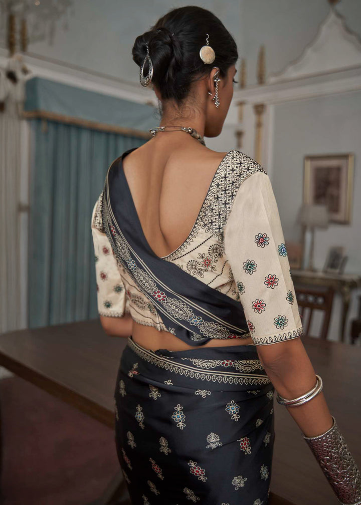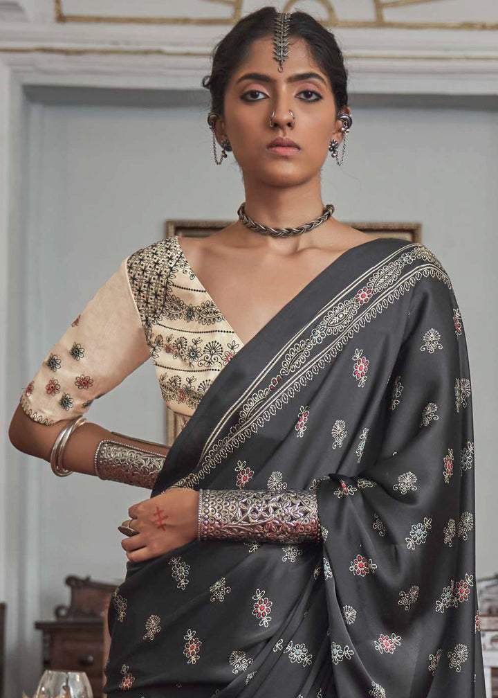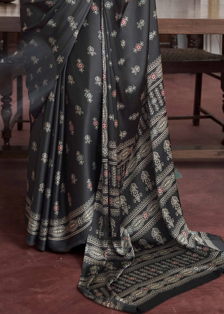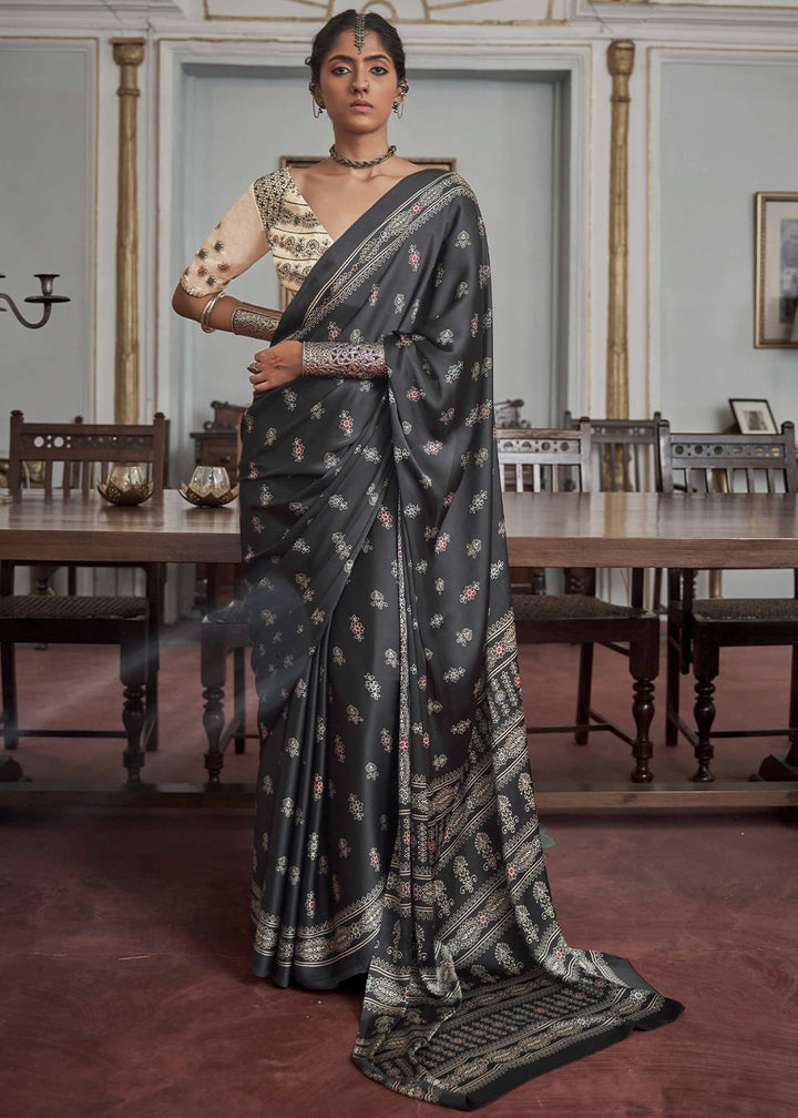 Charcoal Black Digital Printed Gajji Silk Saree Featuring Embroidered Blouse