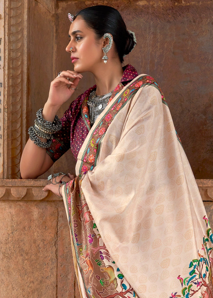 Cream White Printed Silk Saree with Floral & Jungle Motifs