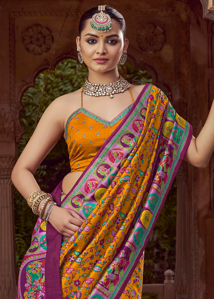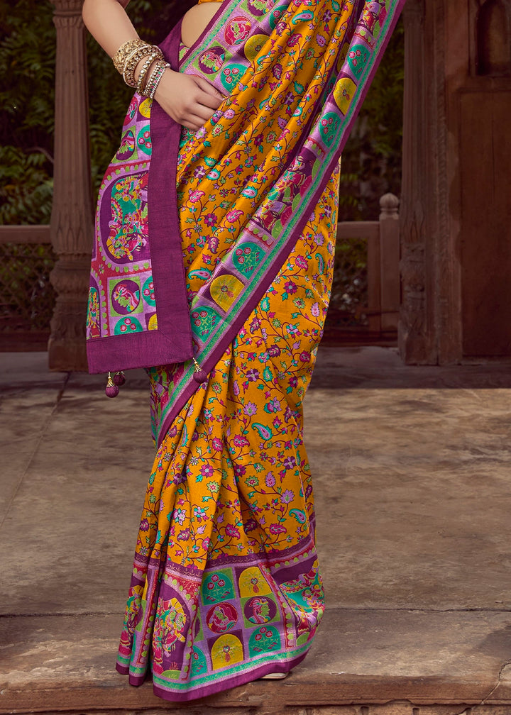 Mustard Yellow Floral Printed Silk Saree