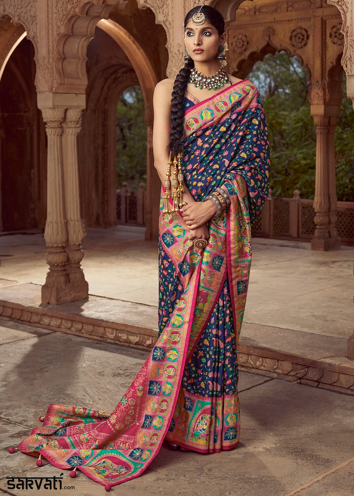 Navy Blue Floral Printed Silk Saree