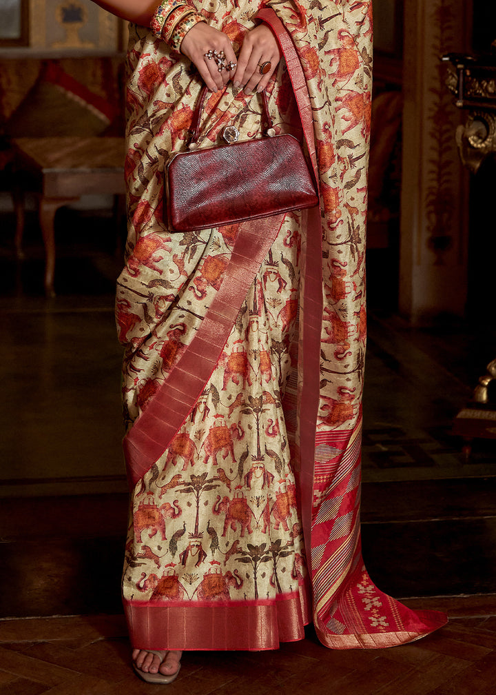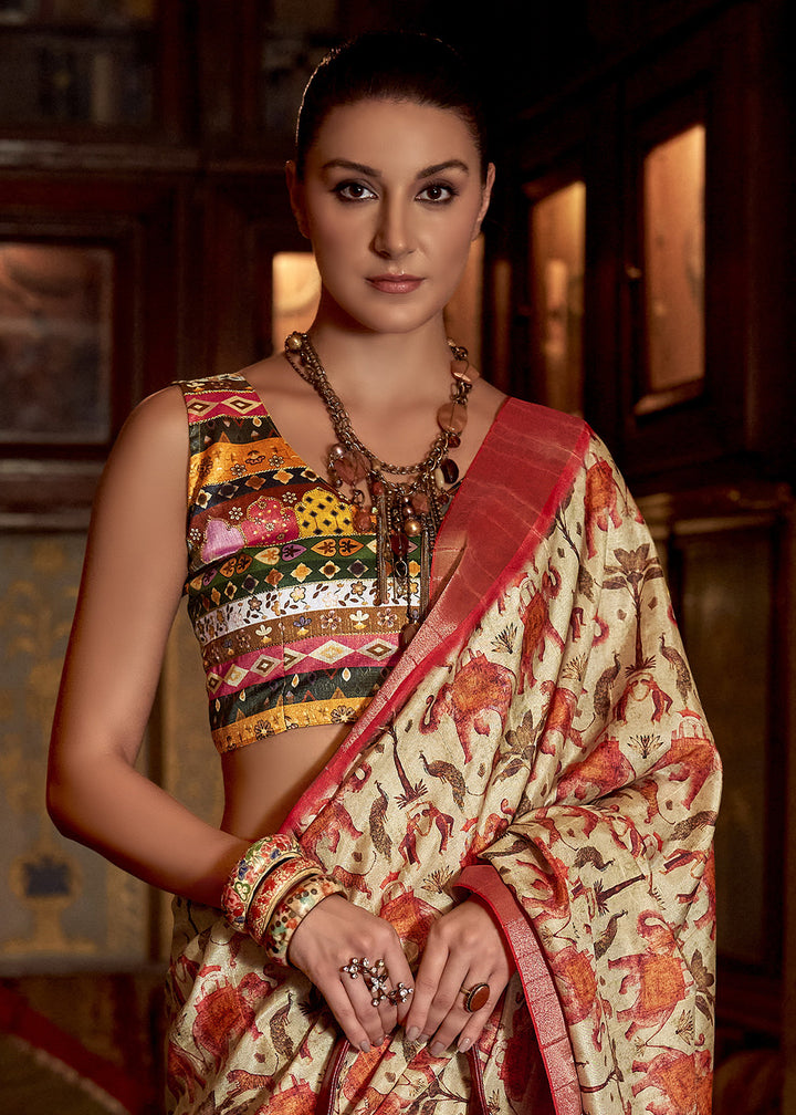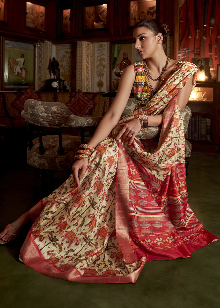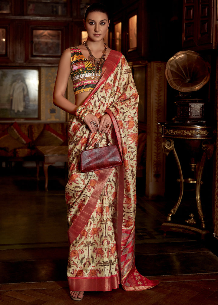 Off White Kotha Zari Silk Saree with Digital Printed Design