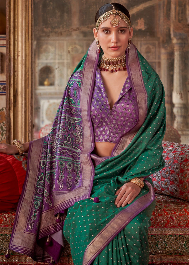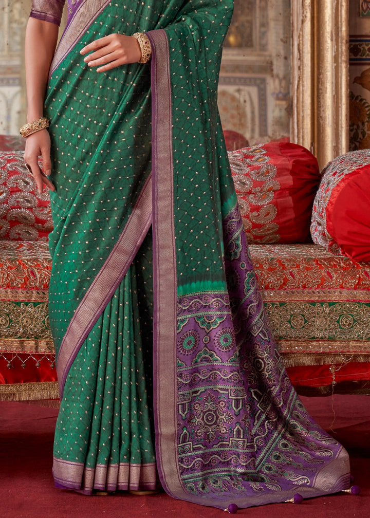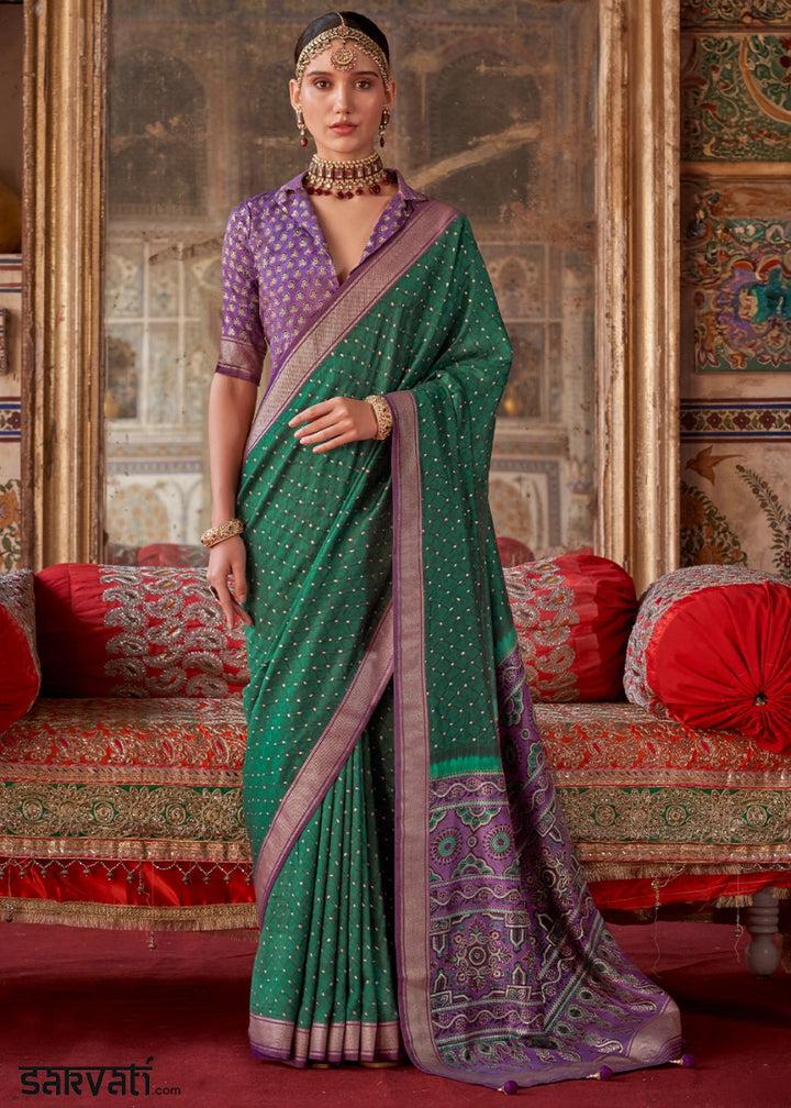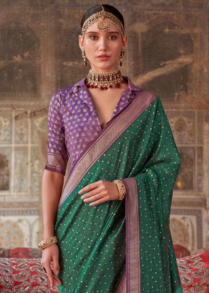 Persian Green Silk Saree with Printed Patterns - House of Sarvati LLC