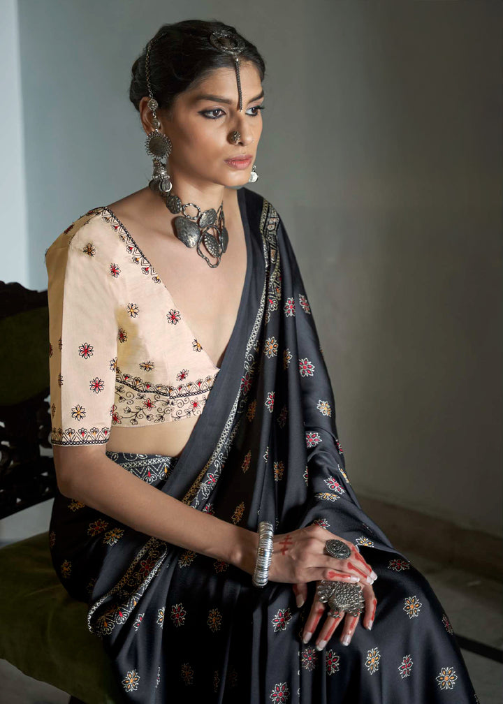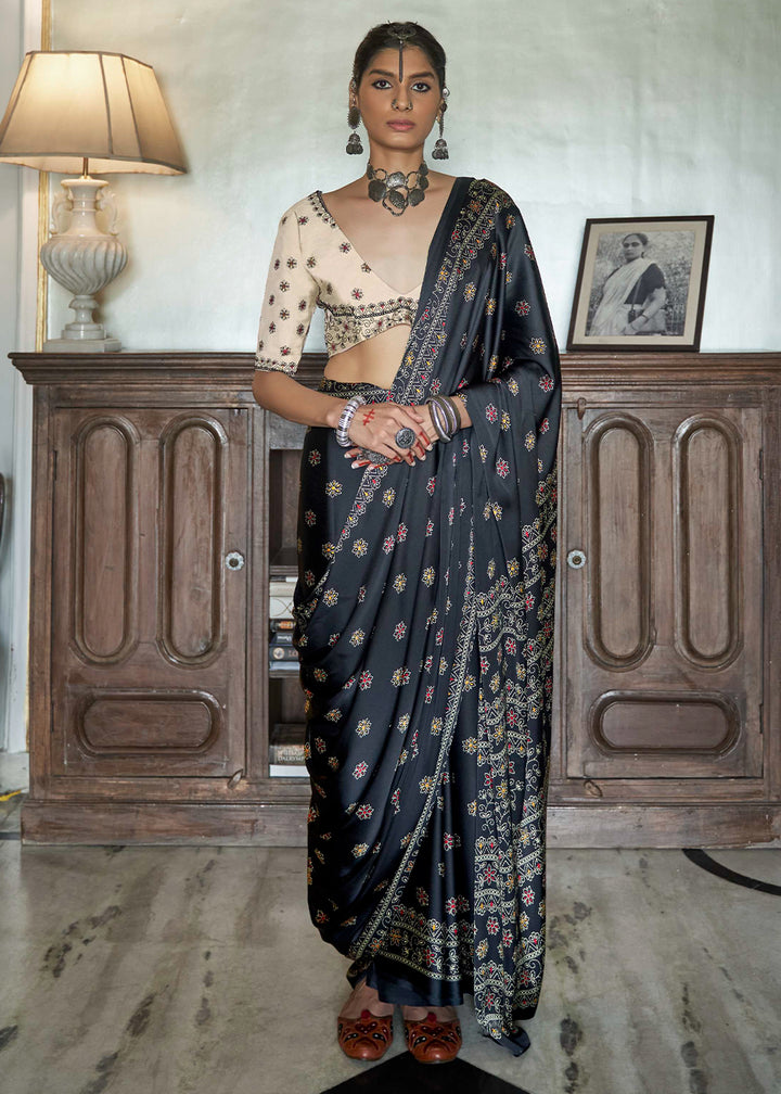 Pitch Black Digital Printed Gajji Silk Saree Featuring Embroidered Blouse