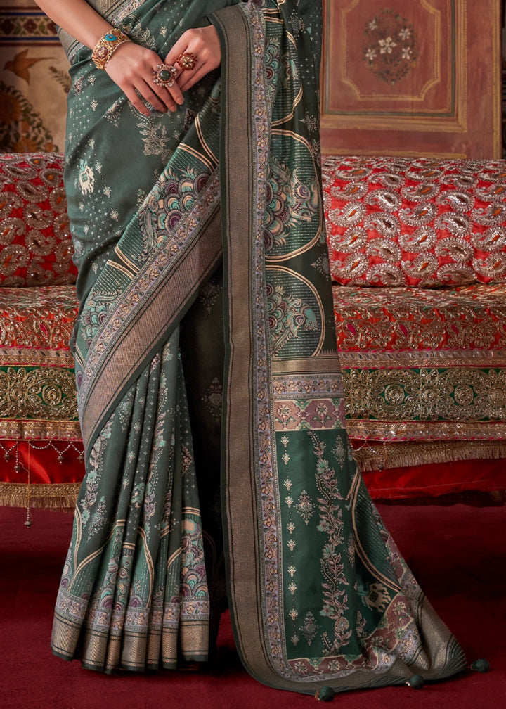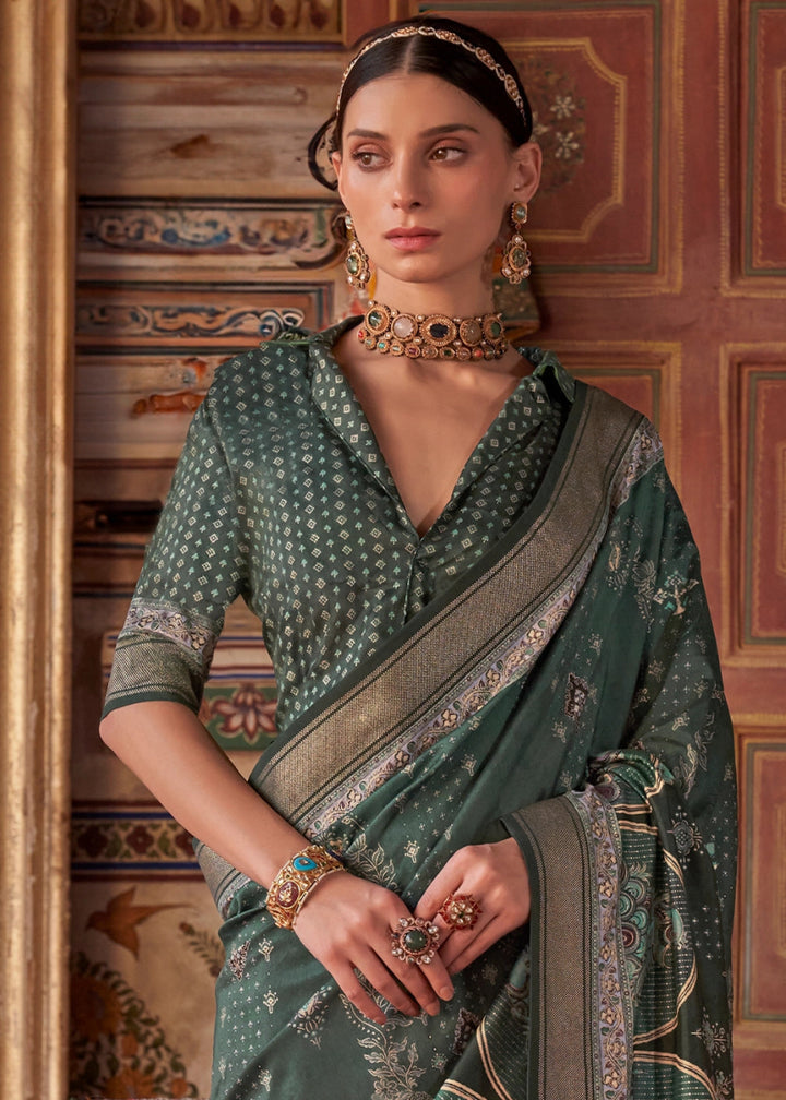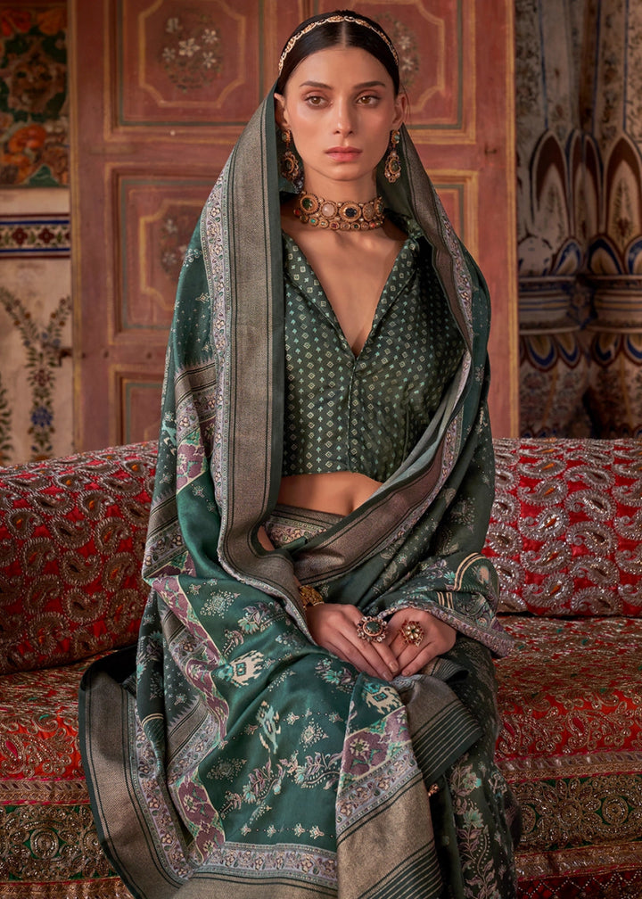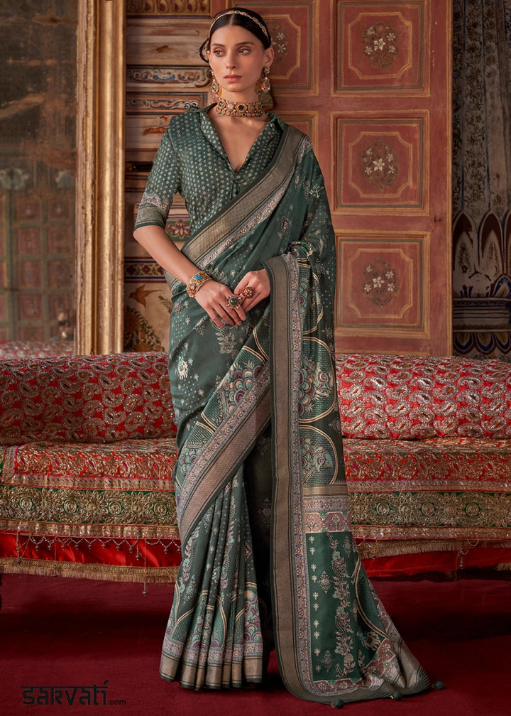 Viridian Green Silk Saree with Printed Patterns - House of Sarvati LLC