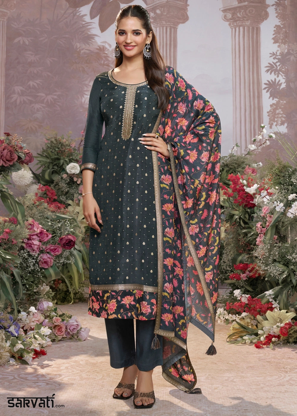 Charcoal Grey Jacquard Work Dola Silk Kurta Set with Floral Printed Dupatta