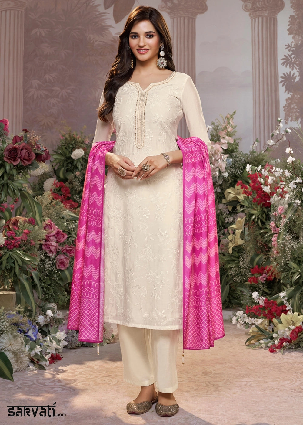 Off White Viscose Suit Set with Thread Work and Pink Printed Dupatta