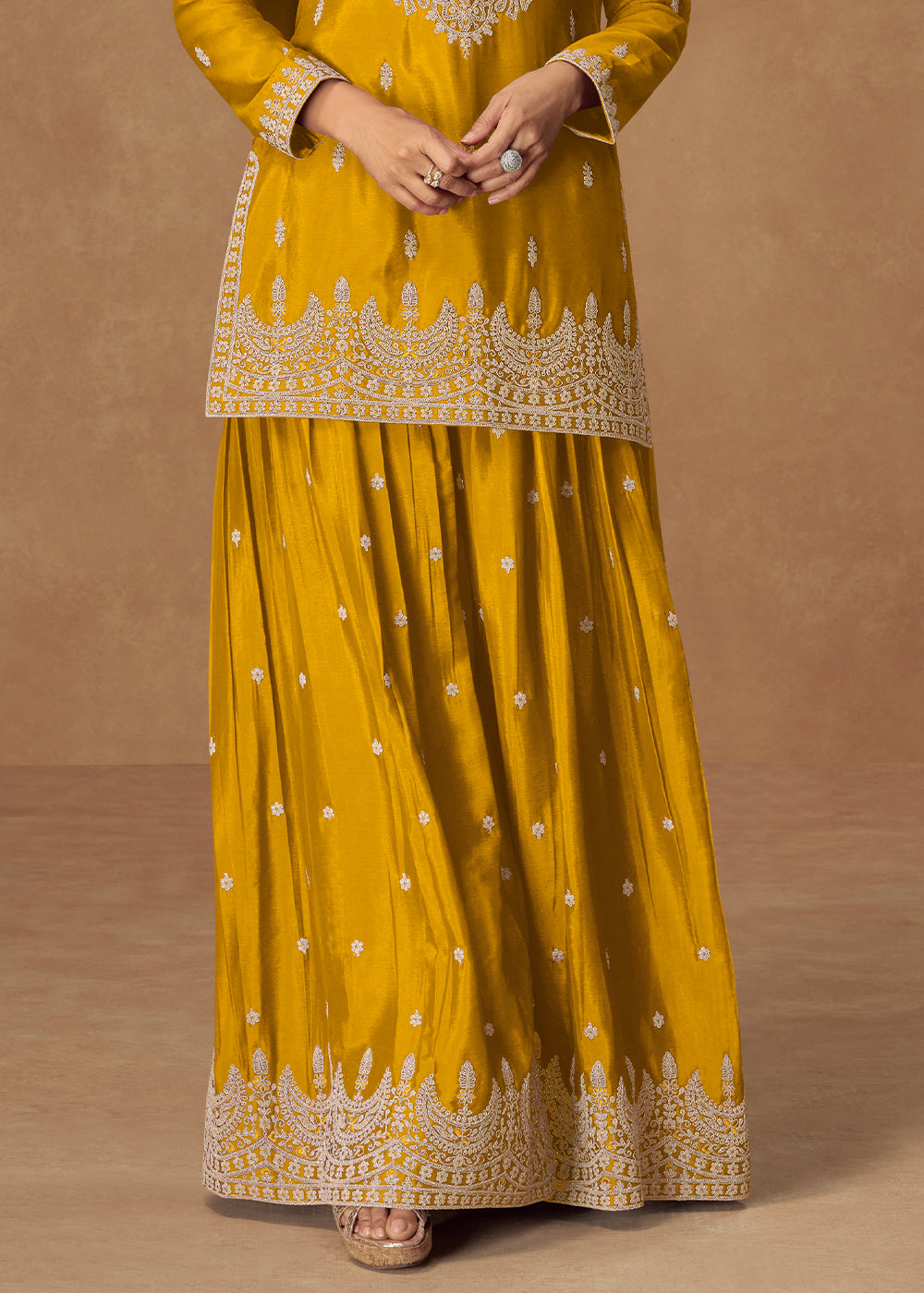 Mustard Yellow Chinon Silk Palazo suit with Intricate embroidery work