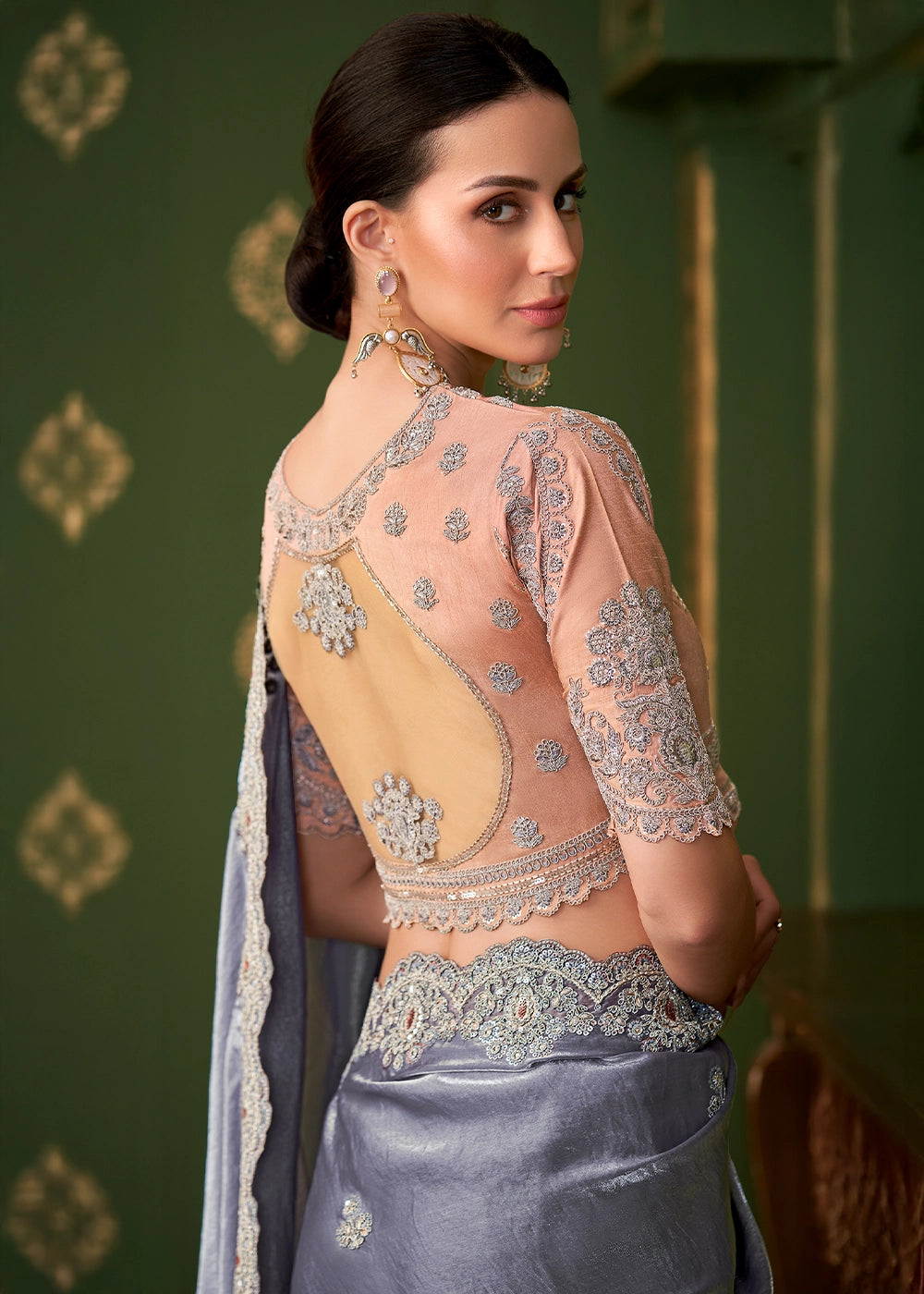 Dual Shade Blue & Grey Organza Tissue Saree Paired with Embroidered Blouse