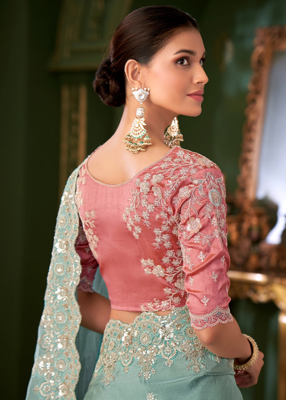 Dual Shade Green & Pink Organza Tissue Saree Paired with Embroidered Blouse