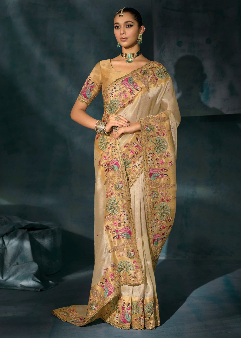 Cream White Banarasi Silk Saree with Jari, Thread, Cut Dana & Moti Work