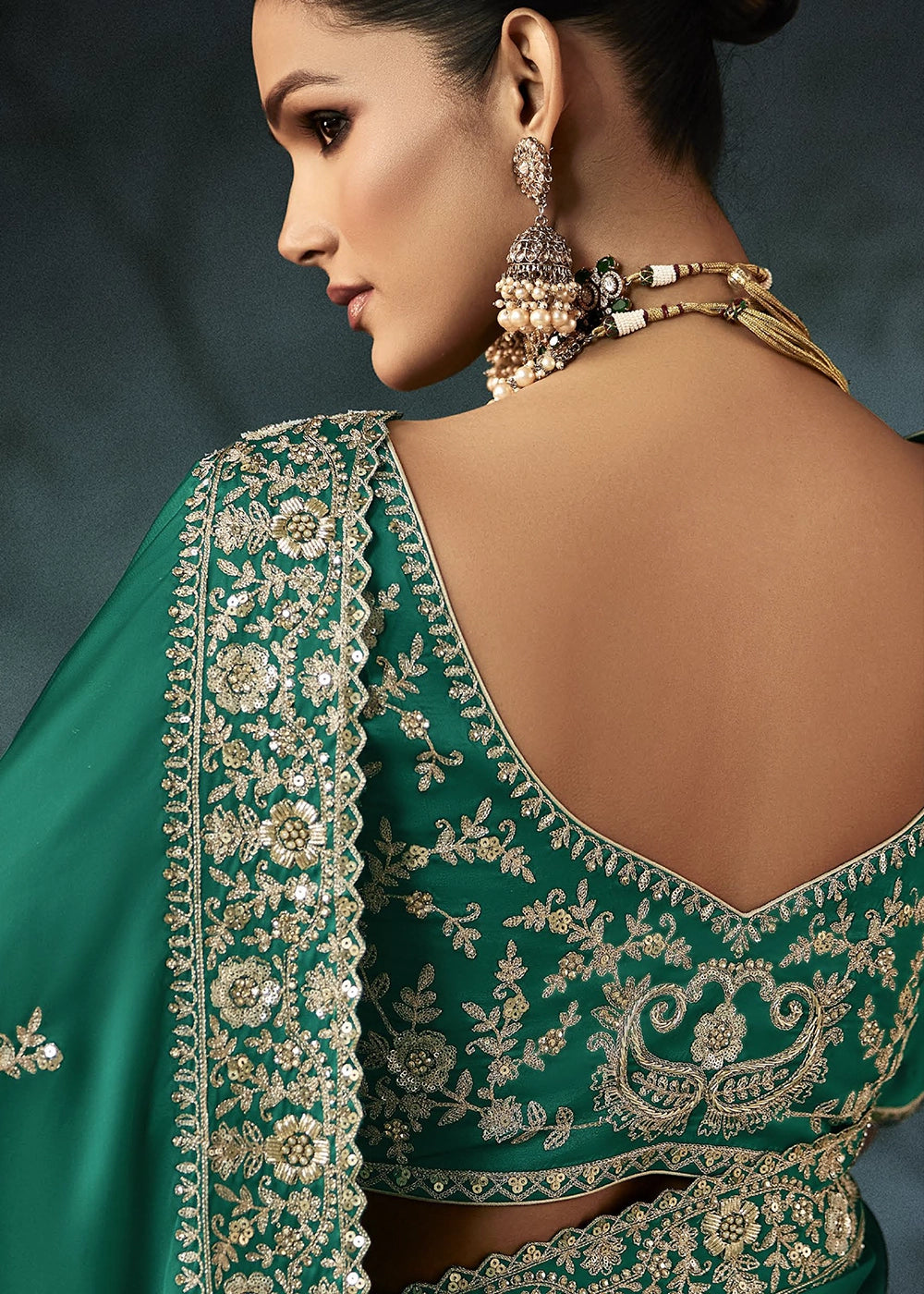 Jade Green Embroidered Satin Crepe Saree with Aari Detailing
