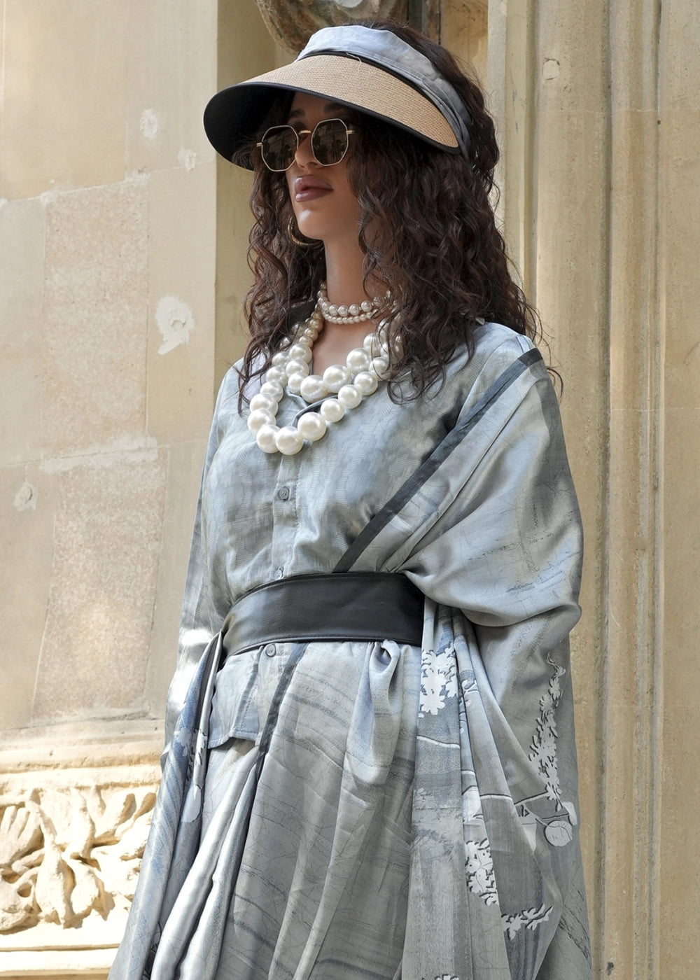 Light Grey Satin Crepe Saree with Contemporary Abstract Print