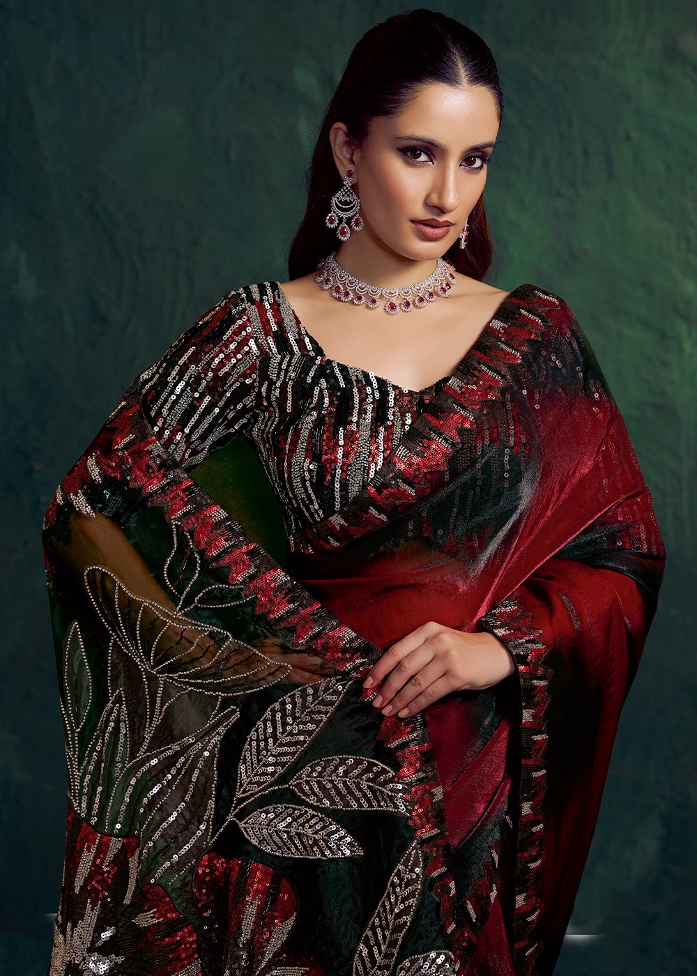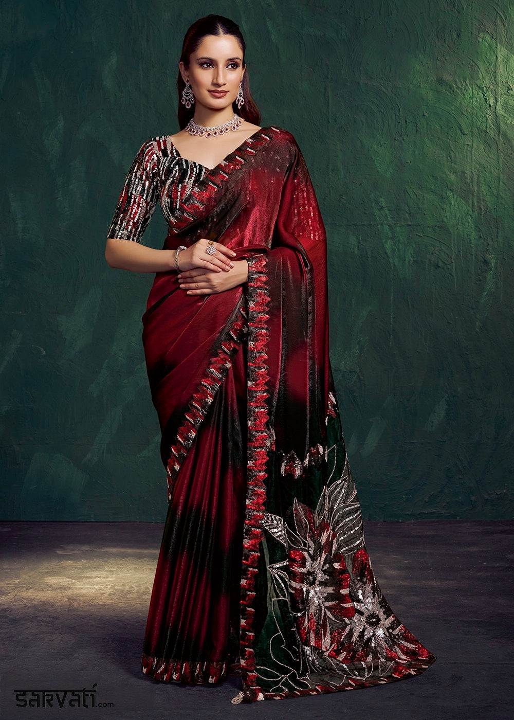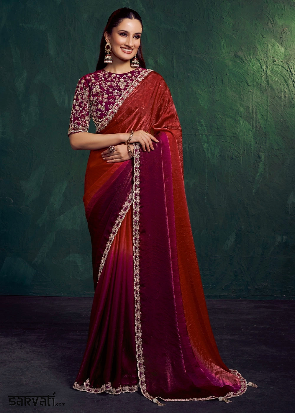 Shades Of Red Satin Silk Saree with Sequins and Beads Embellishment