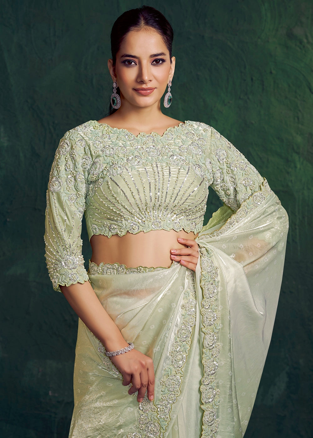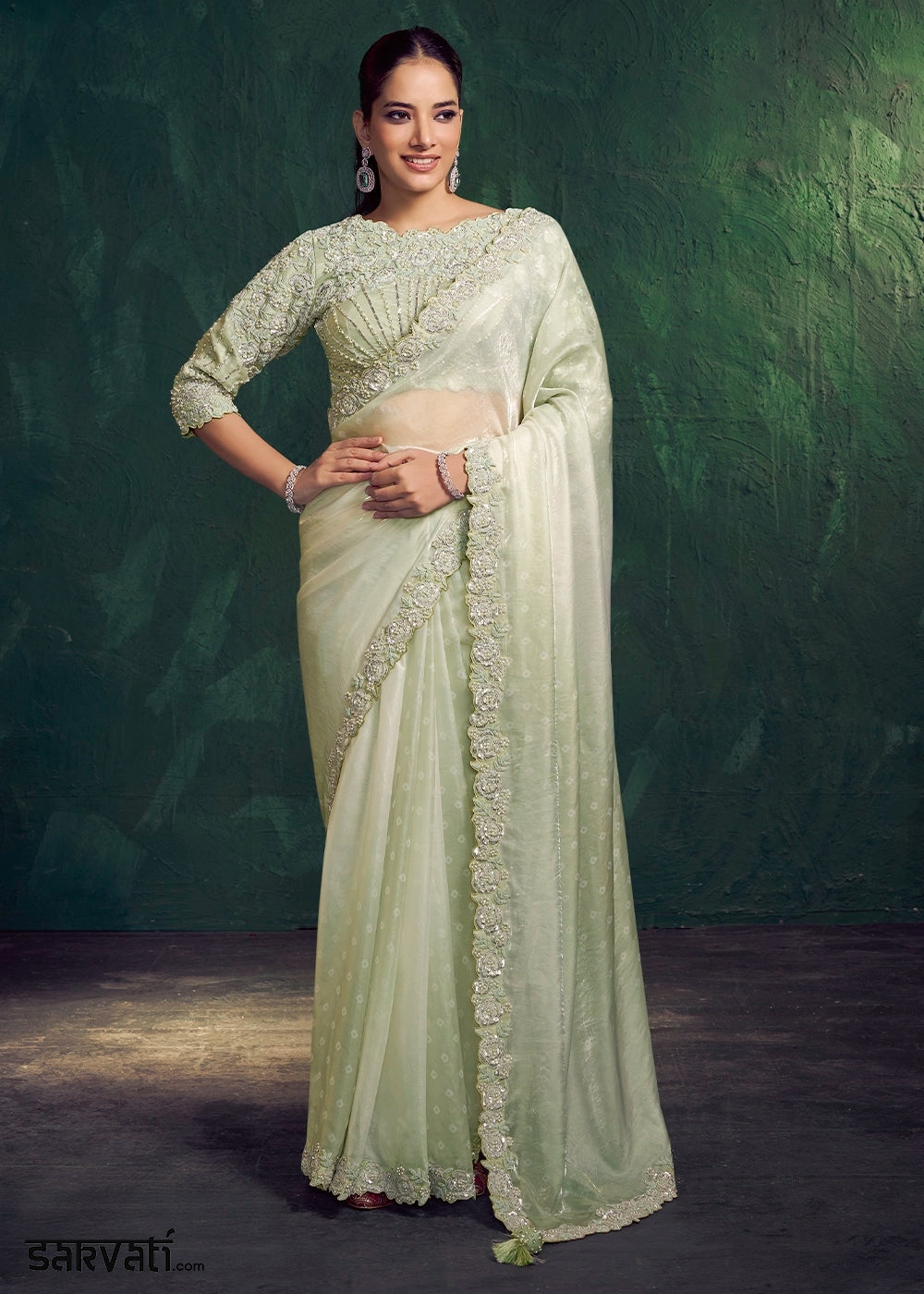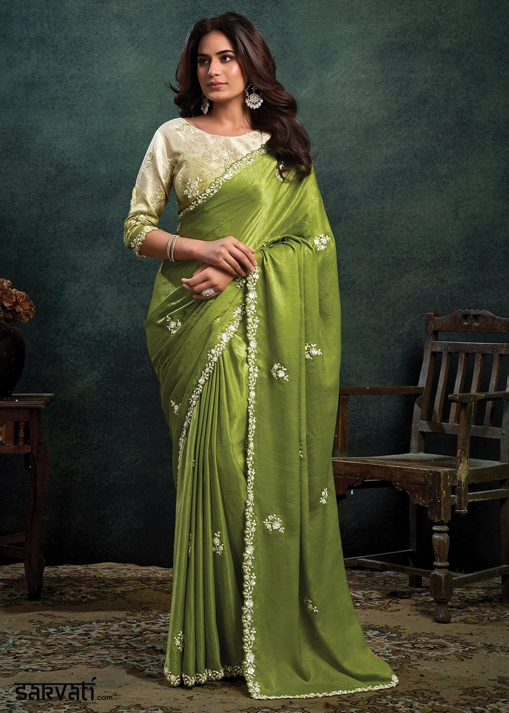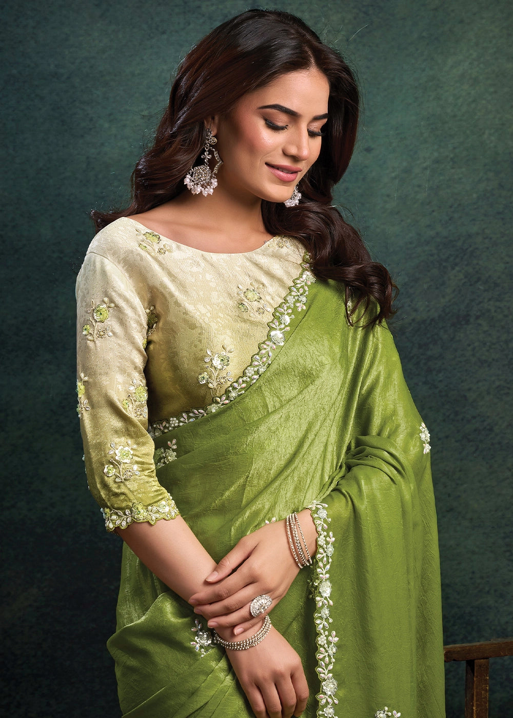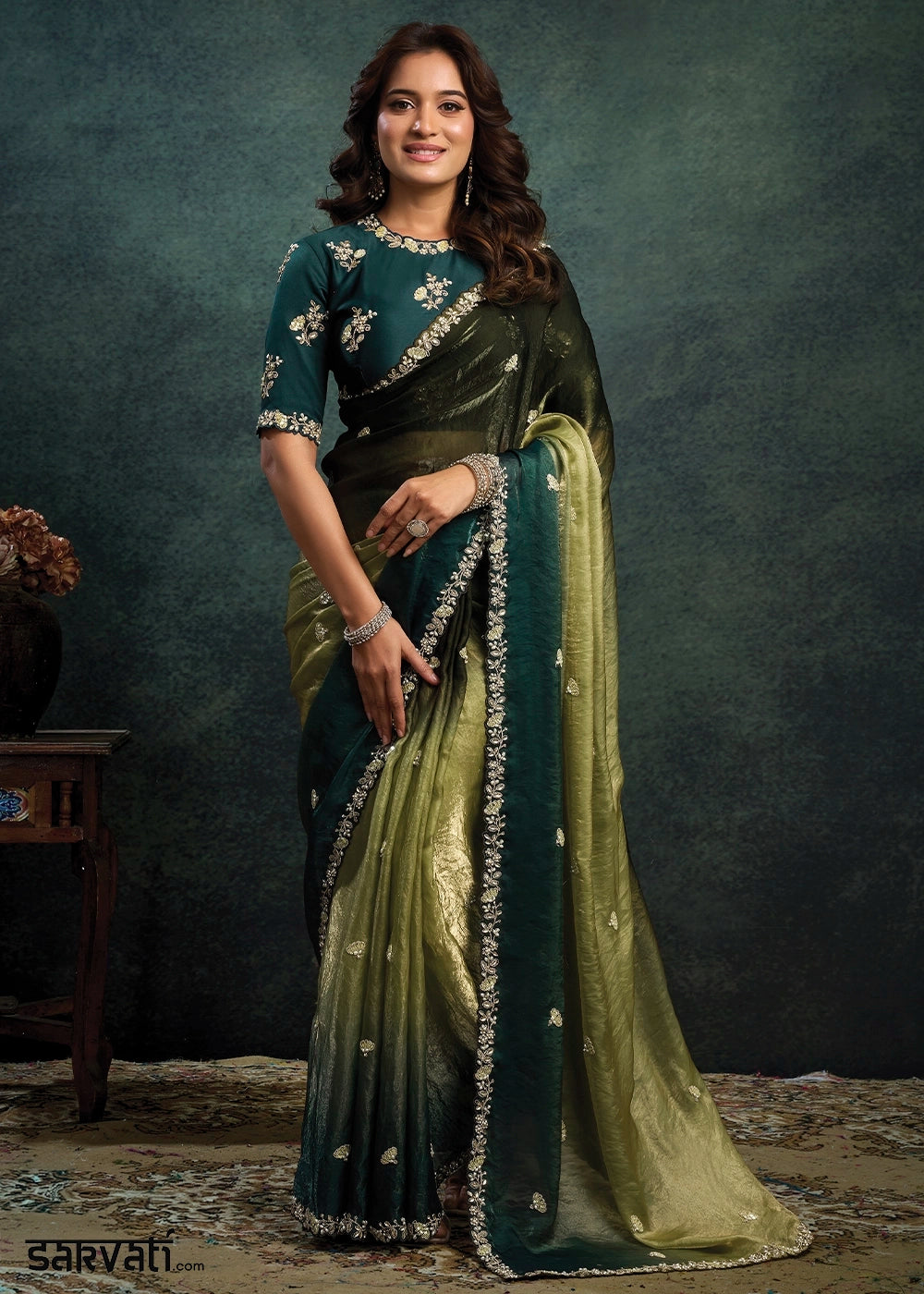 Shades Of Green Satin Silk Saree with Sequins & Stone Embroidery