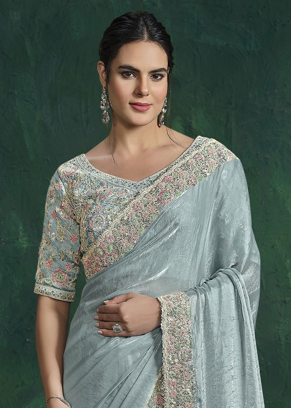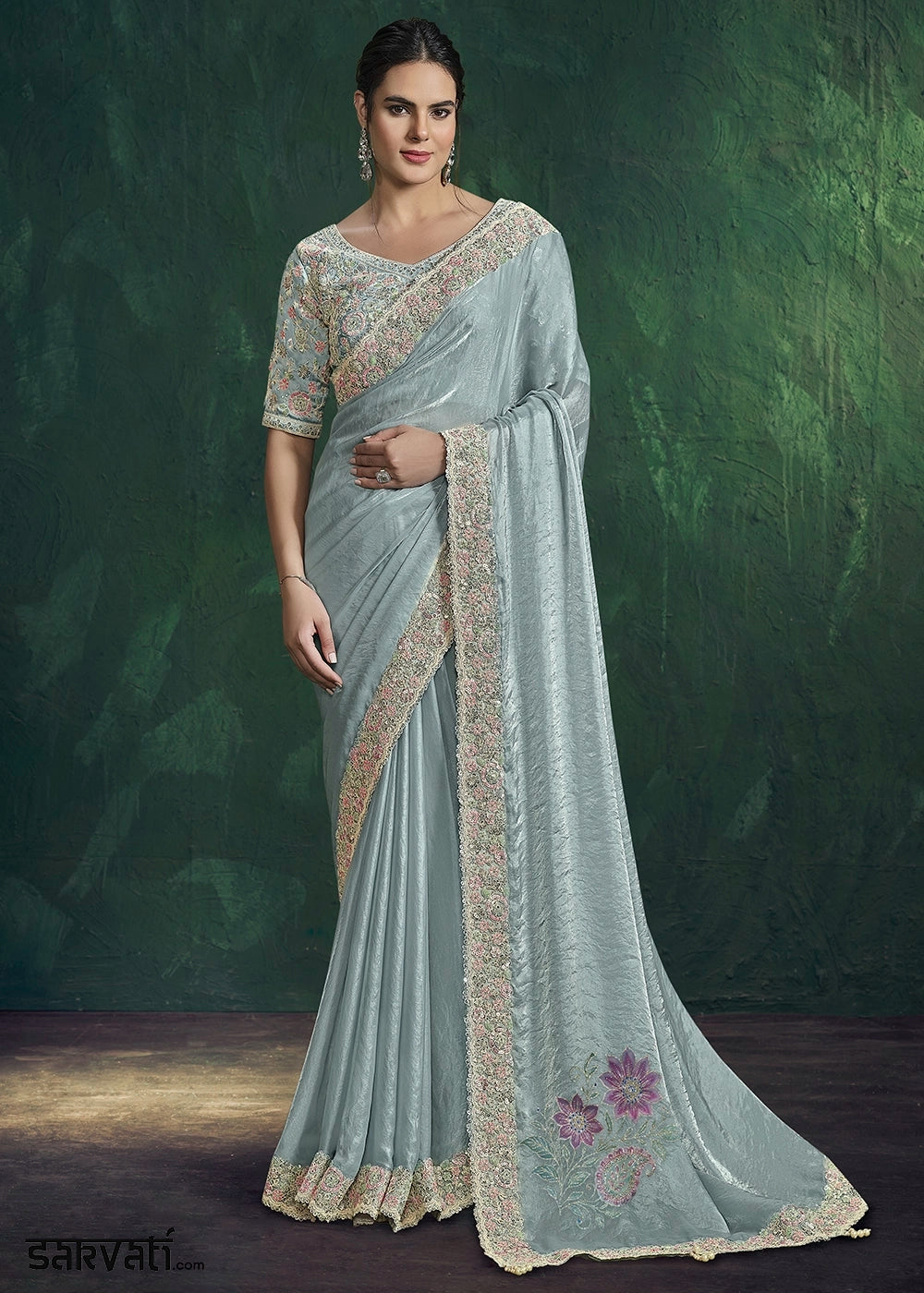 Light Steel Blue Satin Silk Saree with Zari Border & Embroidered Blouse