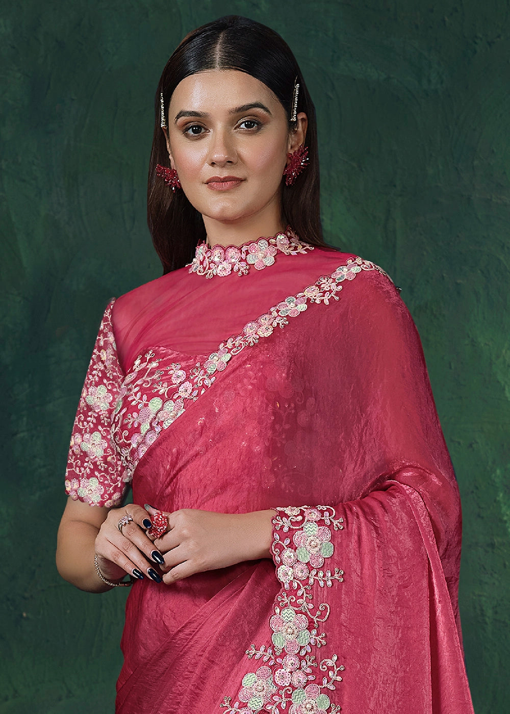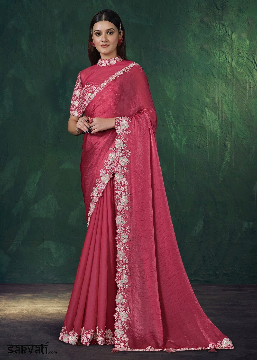 Barbie Pink Satin Silk Embroidered Saree with Floral Thread and Stone Work