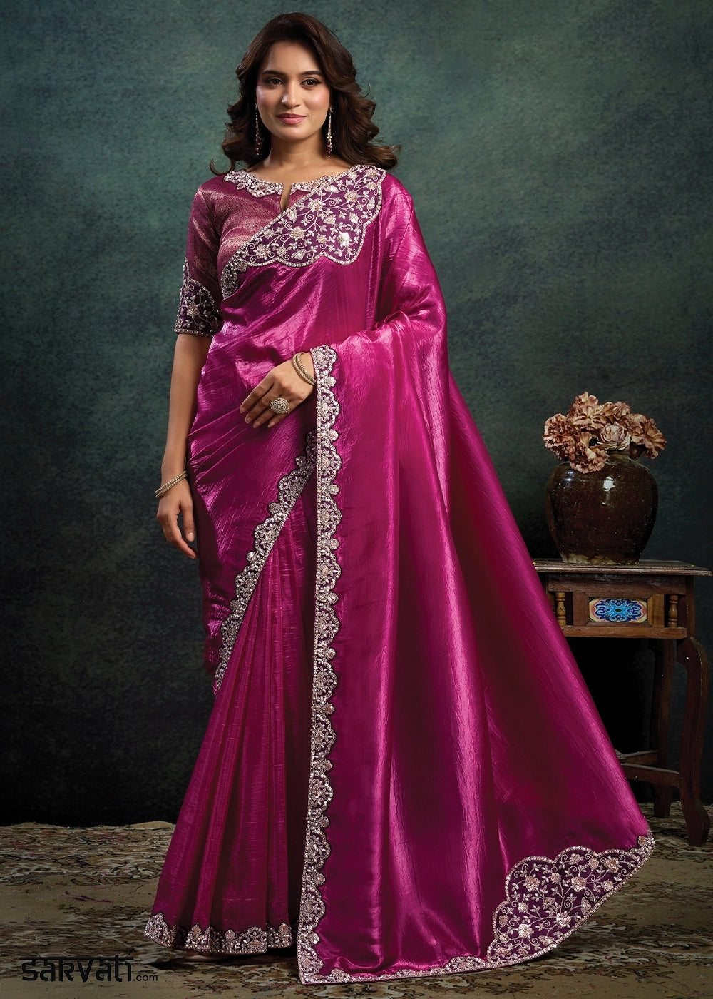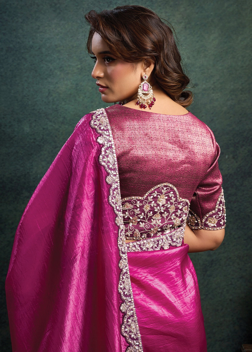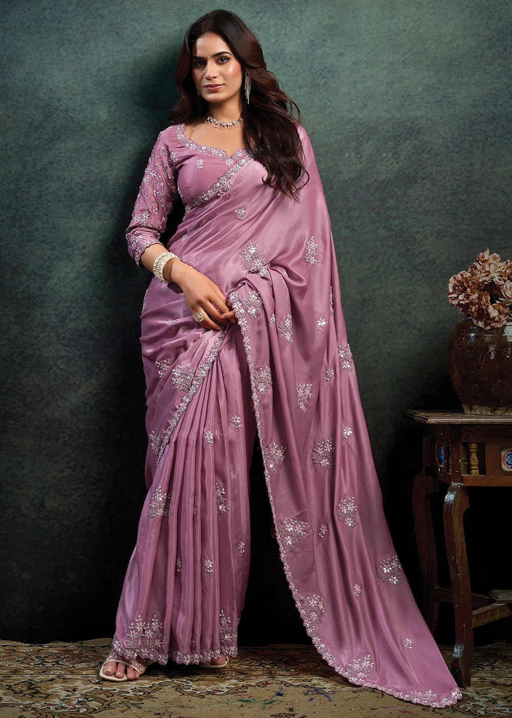 Royal Purple Pink Crush Satin Silk Saree with Pearl & Stone Embroidery