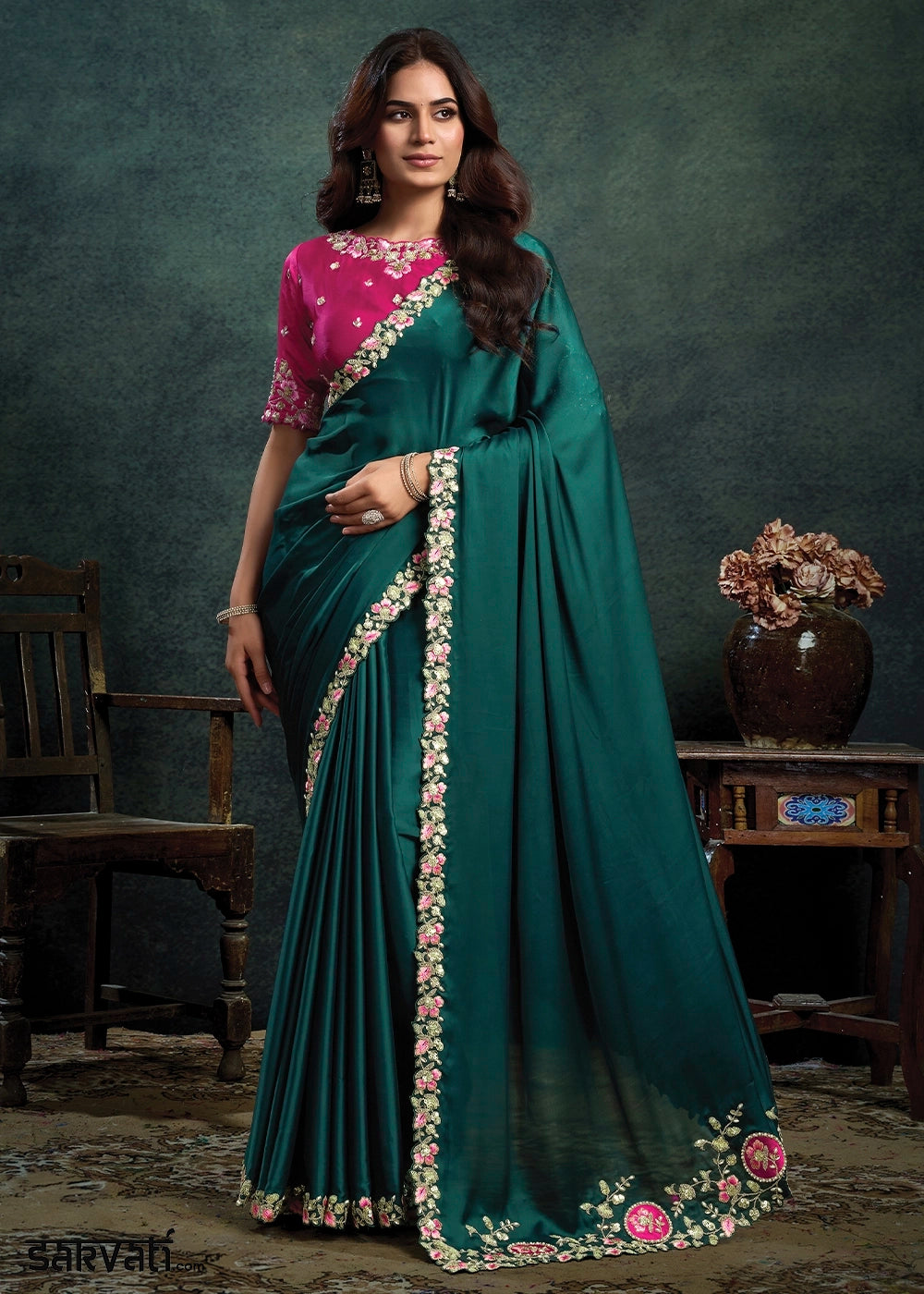 Teal Green Satin Silk Embroidered Saree with Floral Thread and Stone Work