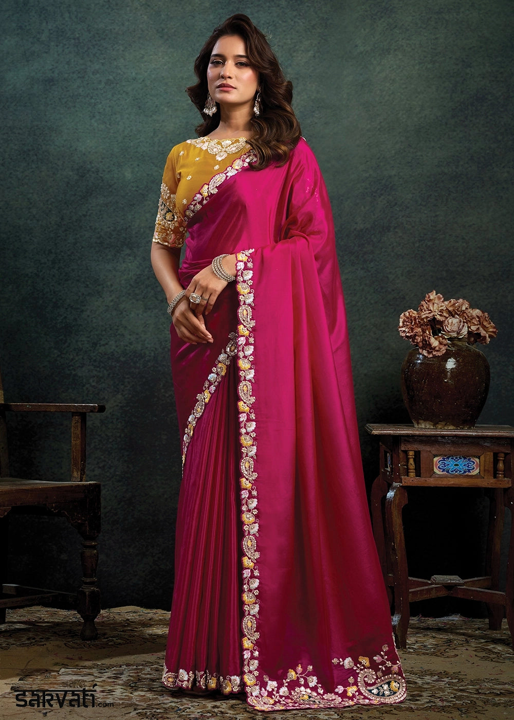 Magenta Pink Satin Silk Saree with Zari Border & Embroidered Blouse