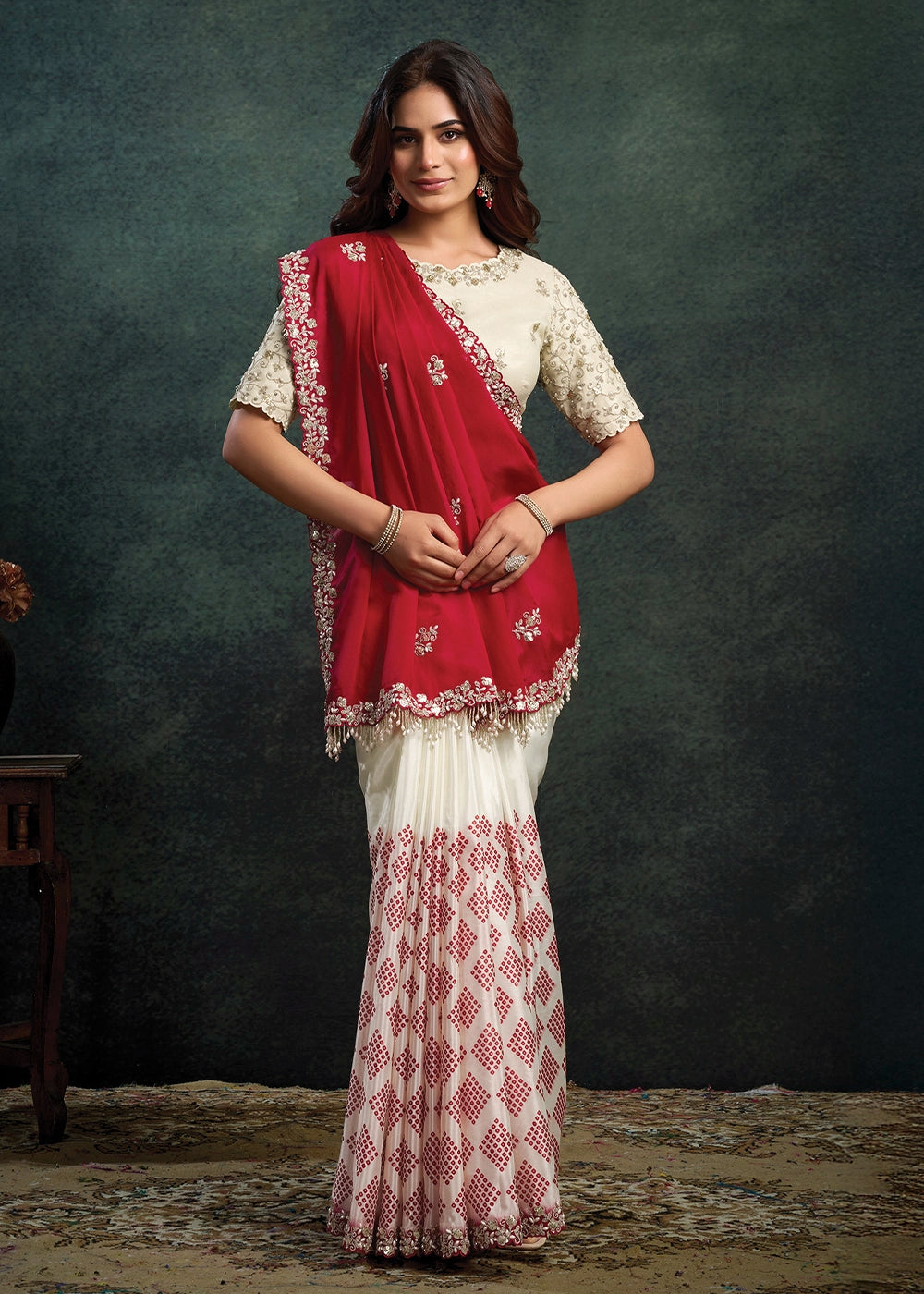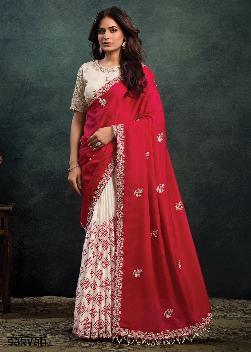 Red & White Satin Silk Saree with Sequins & Pearl work Embroidery