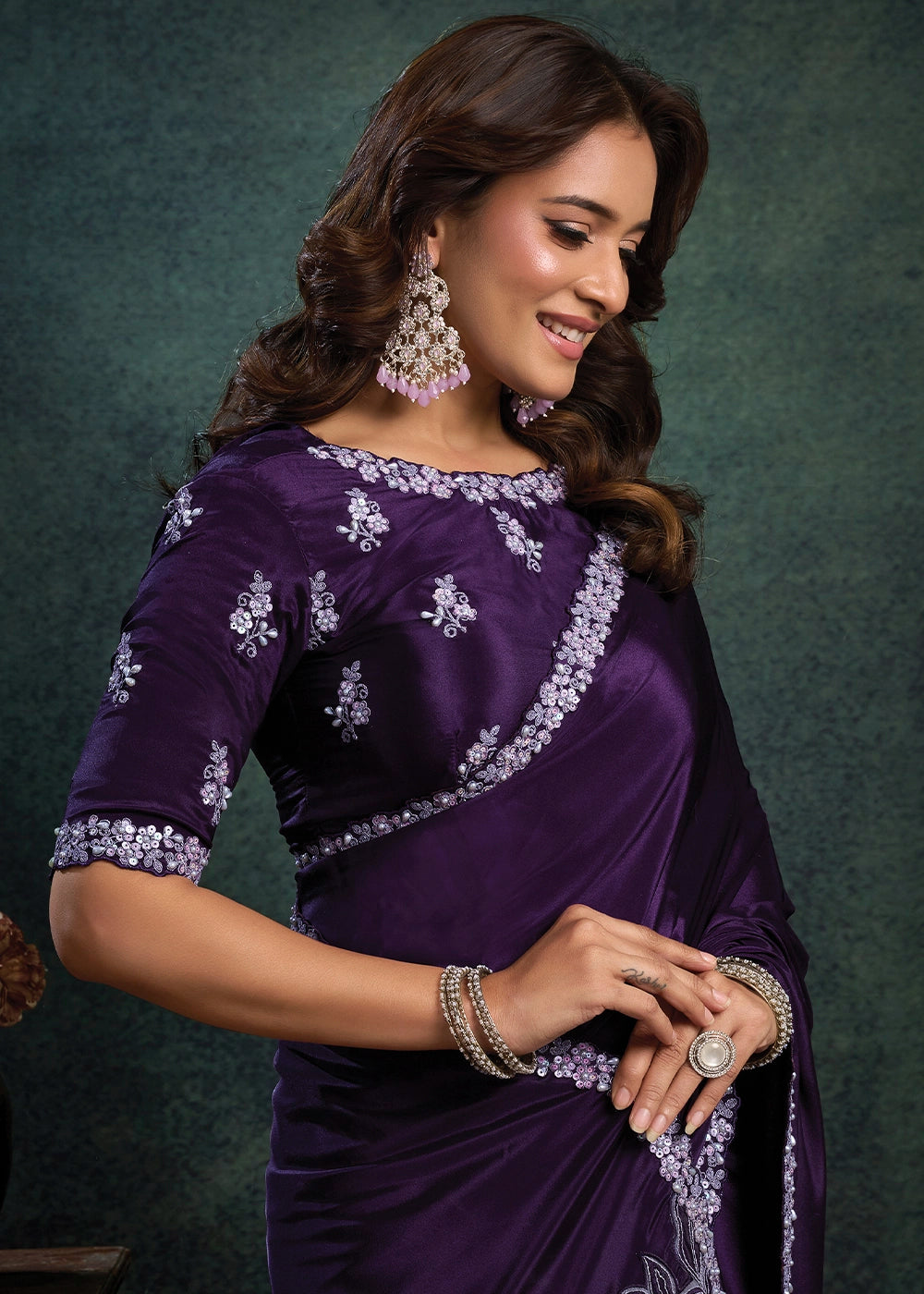 Plum Purple Satin Silk Saree with Pearl & Applique work