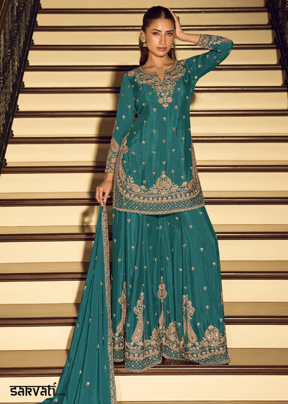 Jade Teal Blue Chinon Silk Sharara Suit with Exquisite Embroidery