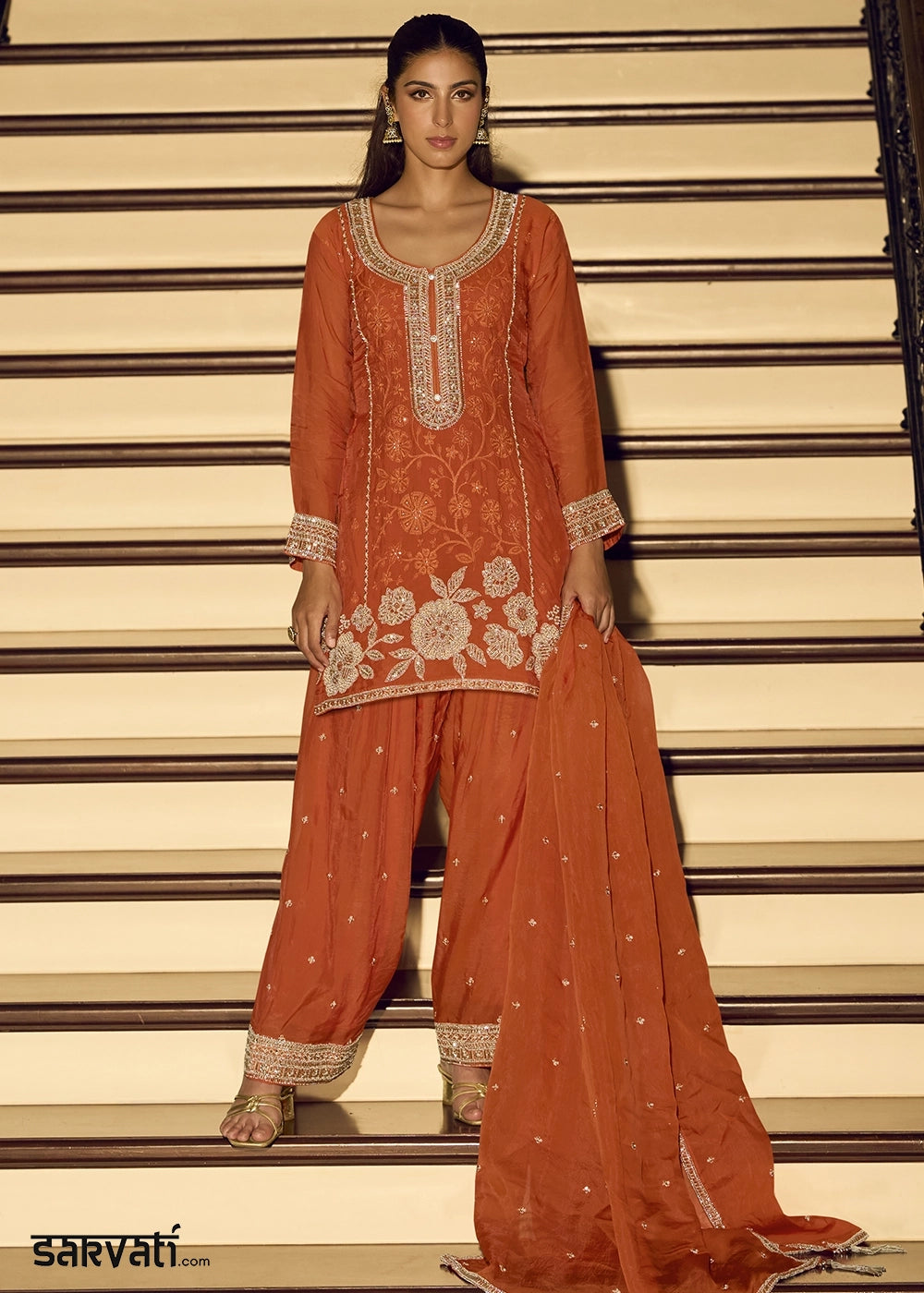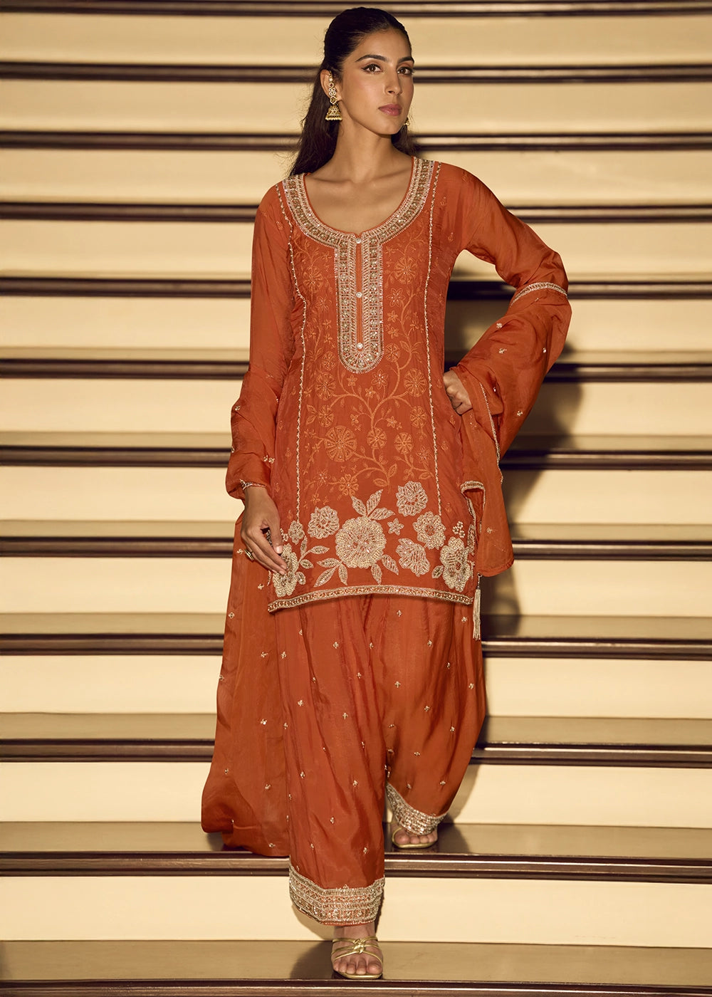 Tiger Orange Chinon Silk Sharara Suit with Exquisite Embroidery