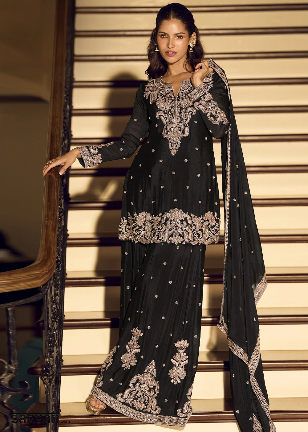 Jet Black Chinon Silk Sharara Suit with Intricate Multi Thread & Sequin Embroidery