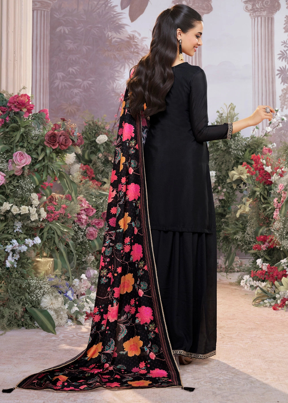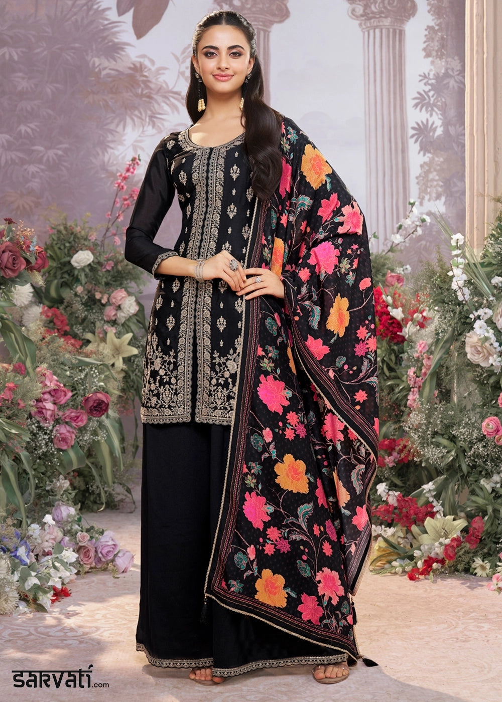 Jade Black Chinon Silk Sharara Suit with Floral Print & Embroidery