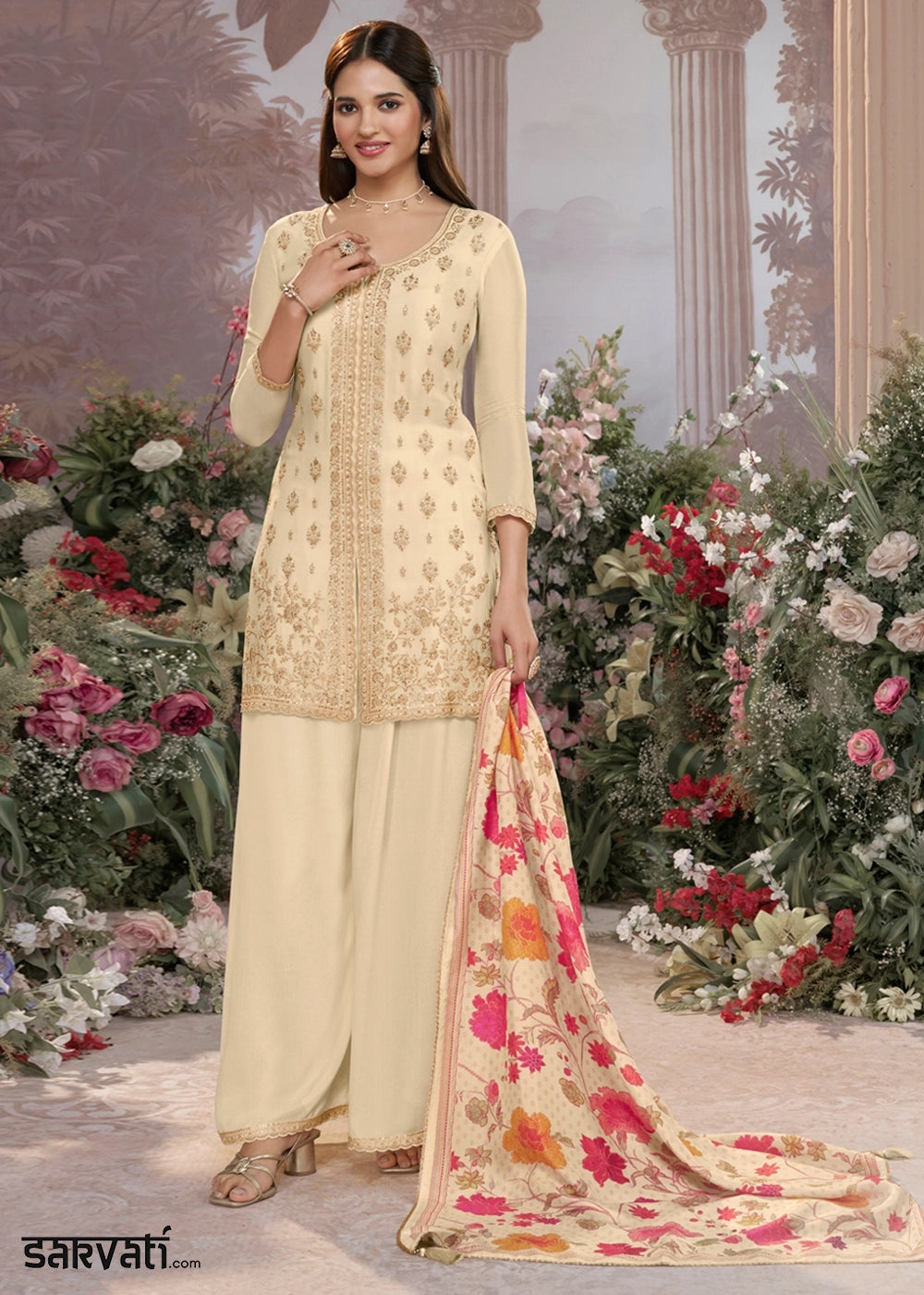 Cream White Dola Silk Sharara Suit with Embroidery & Jacquard Work
