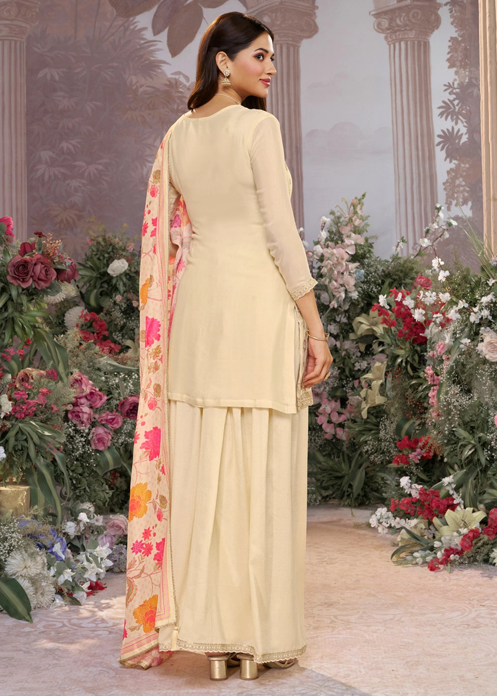 Cream White Chinon Silk Sharara Suit with Floral Print & Embroidery