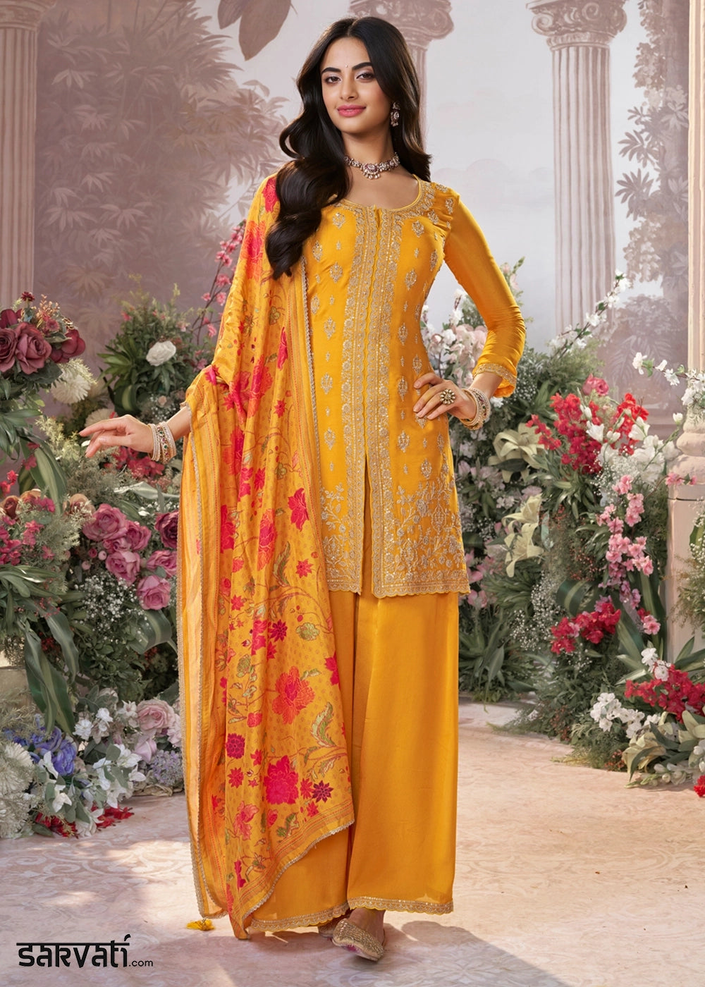 Saffron Yellow Silk Sharara Suit with Digital Print Design & Embroidery